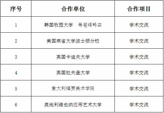 学院积极开展形式多样的国际交流与合作,先后与韩国牧园大学、美国麻省大学波士顿分校、英国卡迪夫大学、英国拉夫堡大学、意大利福贾美术学院、奥地利维也纳应用艺术大学开展学术交流,不断探索并创新,推进学院教育国际化进程。
