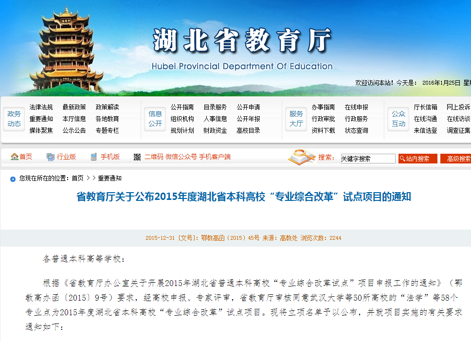 据了解,实施“专业综合改革”试点项目,旨在充分发挥高校的积极性、主动性和创造性,结合办学定位、学科特色和服务面向等,明确专业培养目标和建设重点,优化人才培养方案。按照准确定位、注重内涵、突出优势、强化特色的原则,通过自主设计建设方案,推进培养模式、教学团队、课程教材、教学方式、教学管理等专业发展重要环节的综合改革,促进人才培养水平的整体提升,形成一批教育观念先进、改革成效显著、特色更加鲜明的专业点,引领示范本校其他专业或同类高校相关专业的改革建设。
