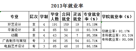 艺术设计学院2013届毕业生共有5个专业460人(其中本科299人,专科161人),其中,本科3个本科专业(环艺设计、平面设计、动画),就业率为93.31%;专科2个专业(广告制作与策划、电脑艺术设计),就业率为90.06%。2013届毕业生总就业率为92.17%。(各专业就业率见下表)