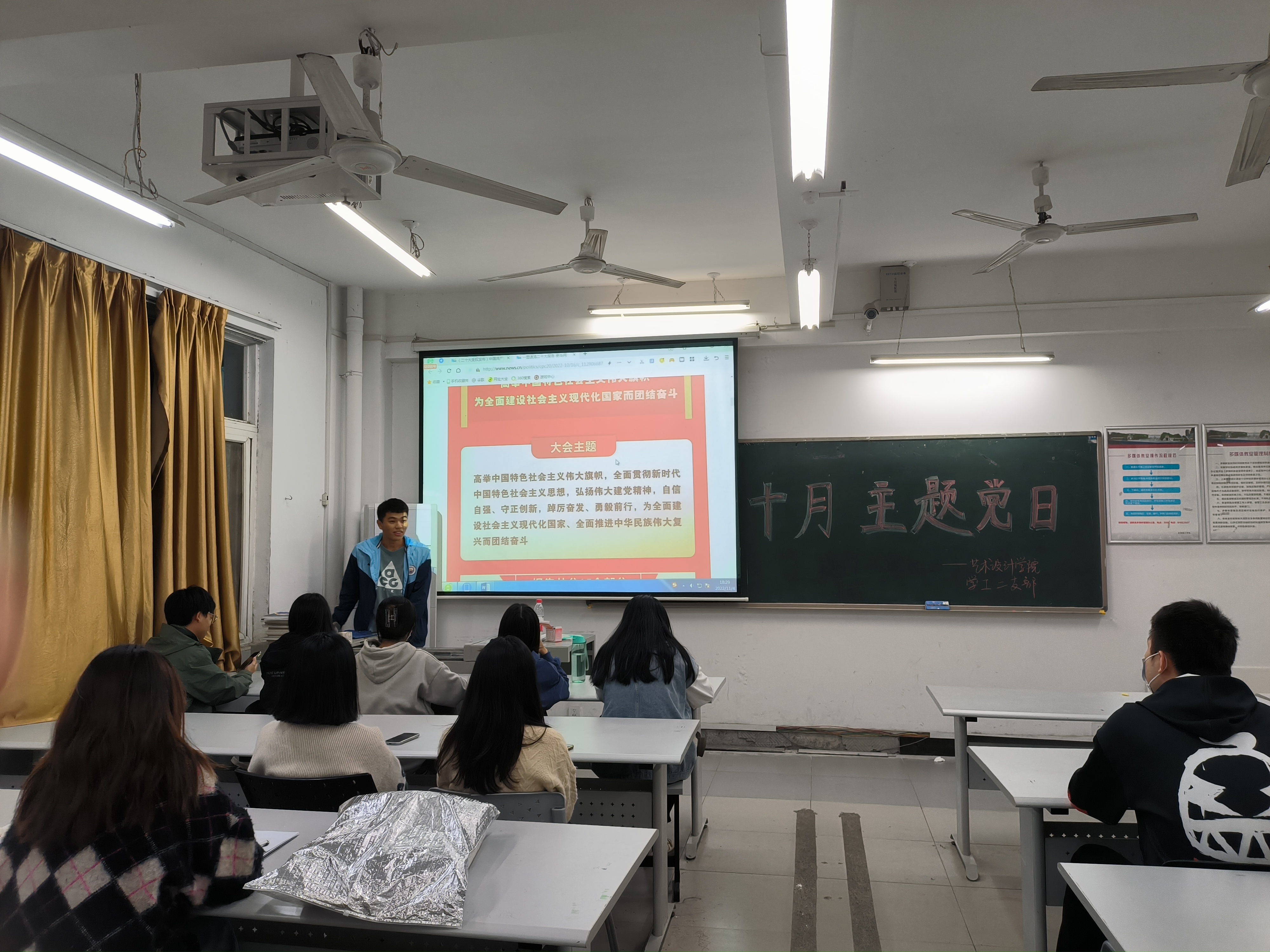 10月22日,在艺术设计学院505教室,开展了五月份党日活动学习——《中国共产党第二十次全国代表大会在京开幕》。大会的主题是:高举中国特色社会主义伟大旗帜,全面贯彻新时代中国特色社会主义思想,弘扬伟大建党精神,自信自强、守正创新,踔厉奋发、勇毅前行,为全面建设社会主义现代化国家、全面推进中华民族伟大复兴而团结奋斗。