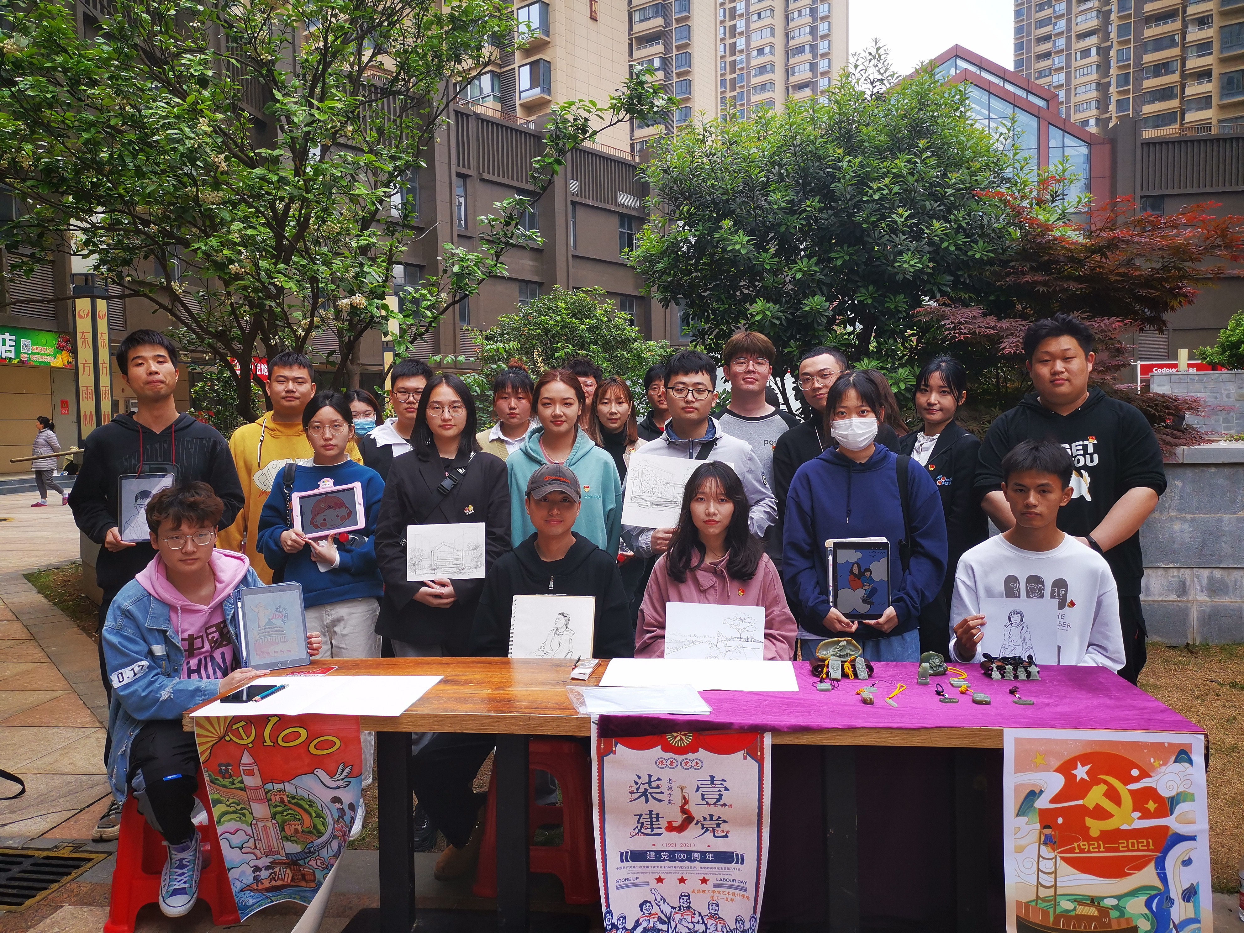 此次活动,艺术设计学院党总支借梅南山社区“奋斗百年路,启航新征程——庆祝建党100周年五一劳动节文艺演出”平台,联合社区党支部,在社区内设立创作与展览台,通过创作党史教育宣传海报、为群众简易人物画像、玉雕作品展览等形式,丰富党史学习教育形式,深化党史学习教育效果。