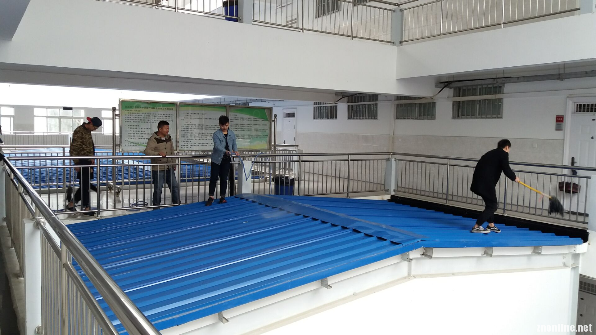 不惧困难,身体力行。为了给学生创造一个全新的生活环境,该院学工二支部书记乐坤更是带领学生从卫生间接出软管,因担忧学生发生危险,独自一人站在预制板房的泡沫屋顶上进行冲洗。乐书记说道:“虽然今天天气不好,但是大家都勤勤恳恳,非常努力的打扫校园,我也感到非常高兴。”