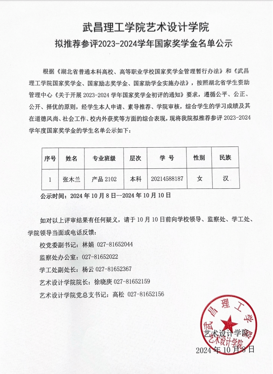 太阳集团2138艺术设计学院拟推荐参评2023-2024学年国家奖学金名单公示