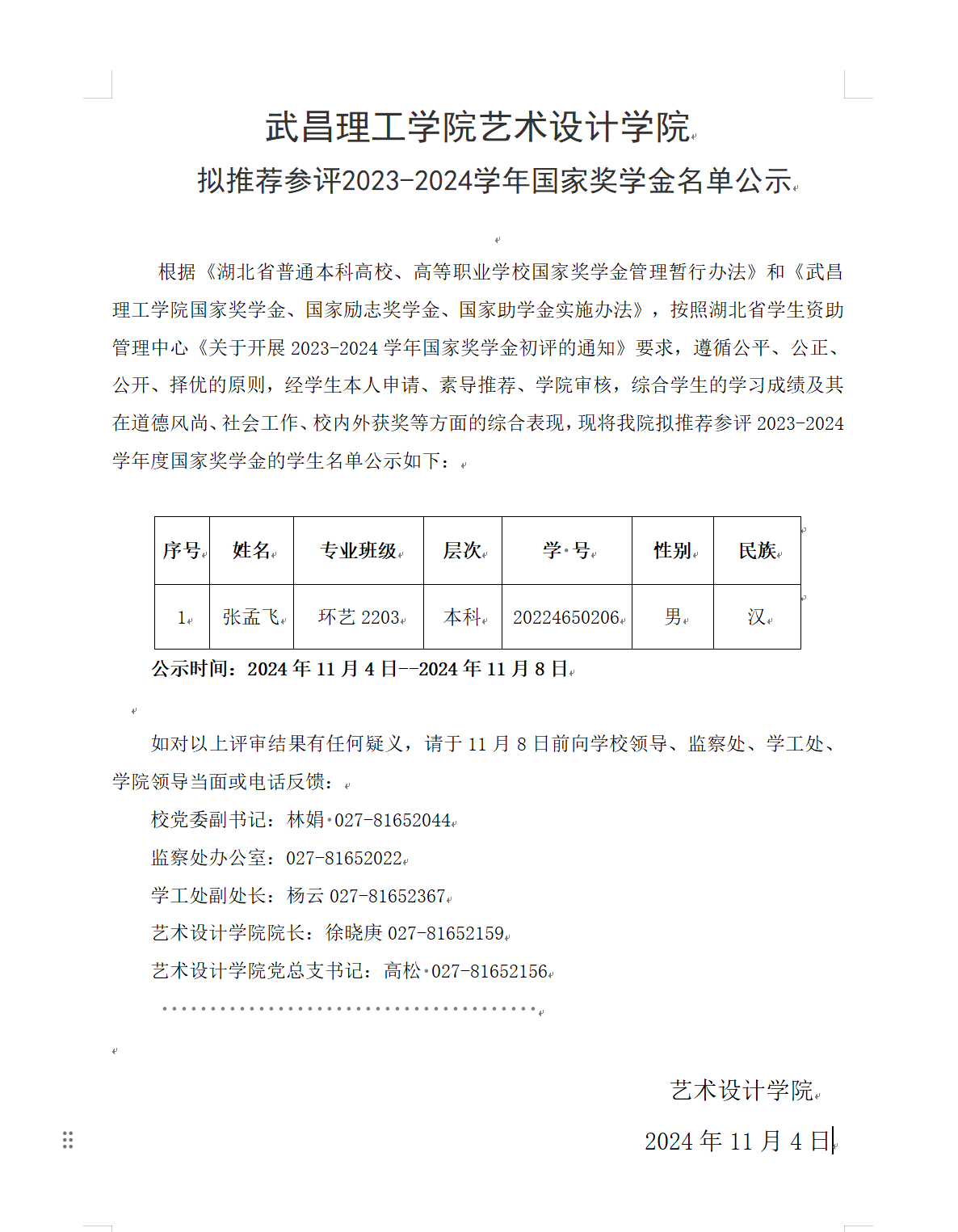 太阳集团2138艺术设计学院拟推荐参评2023-2024学年国家奖学金名单公示