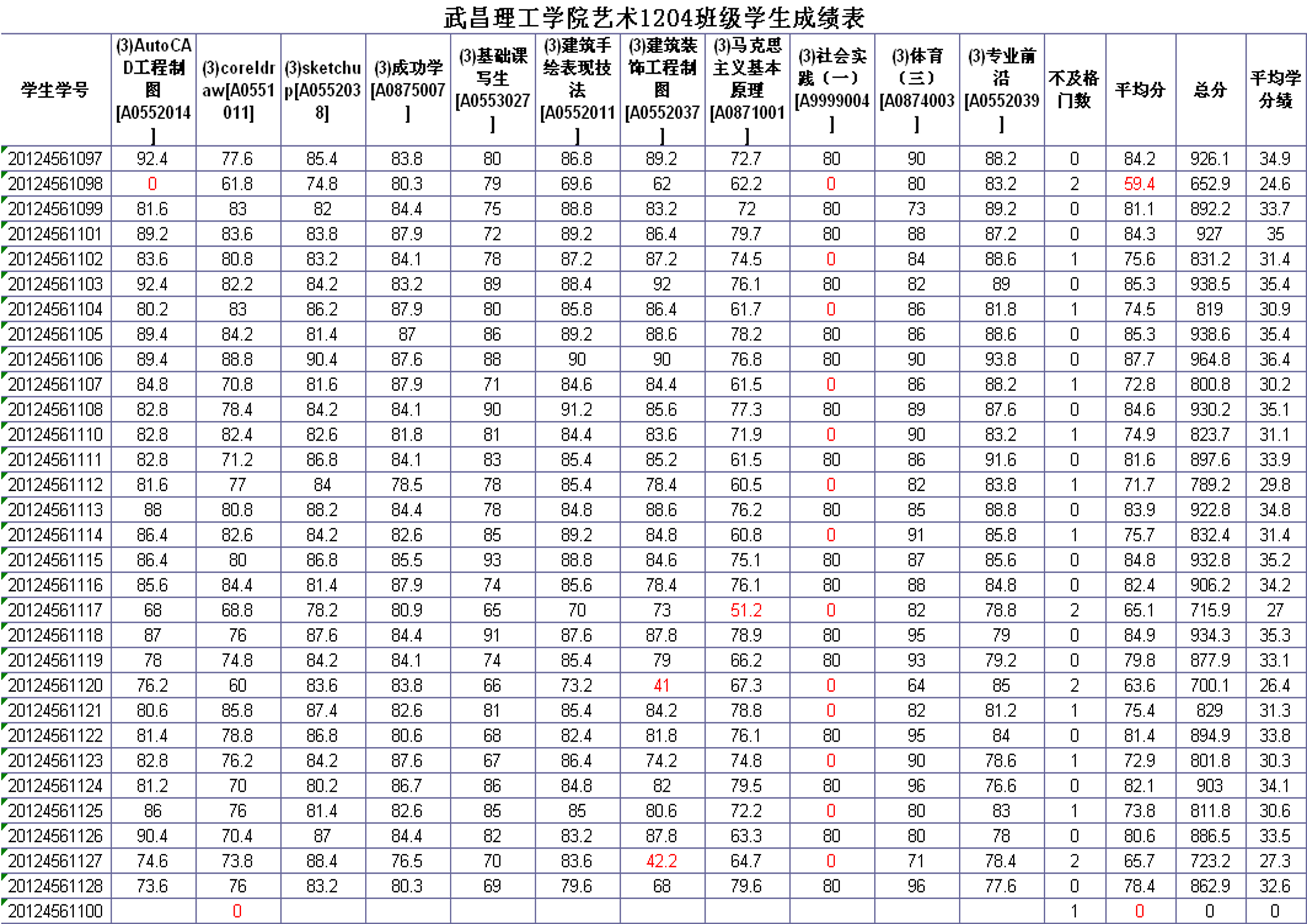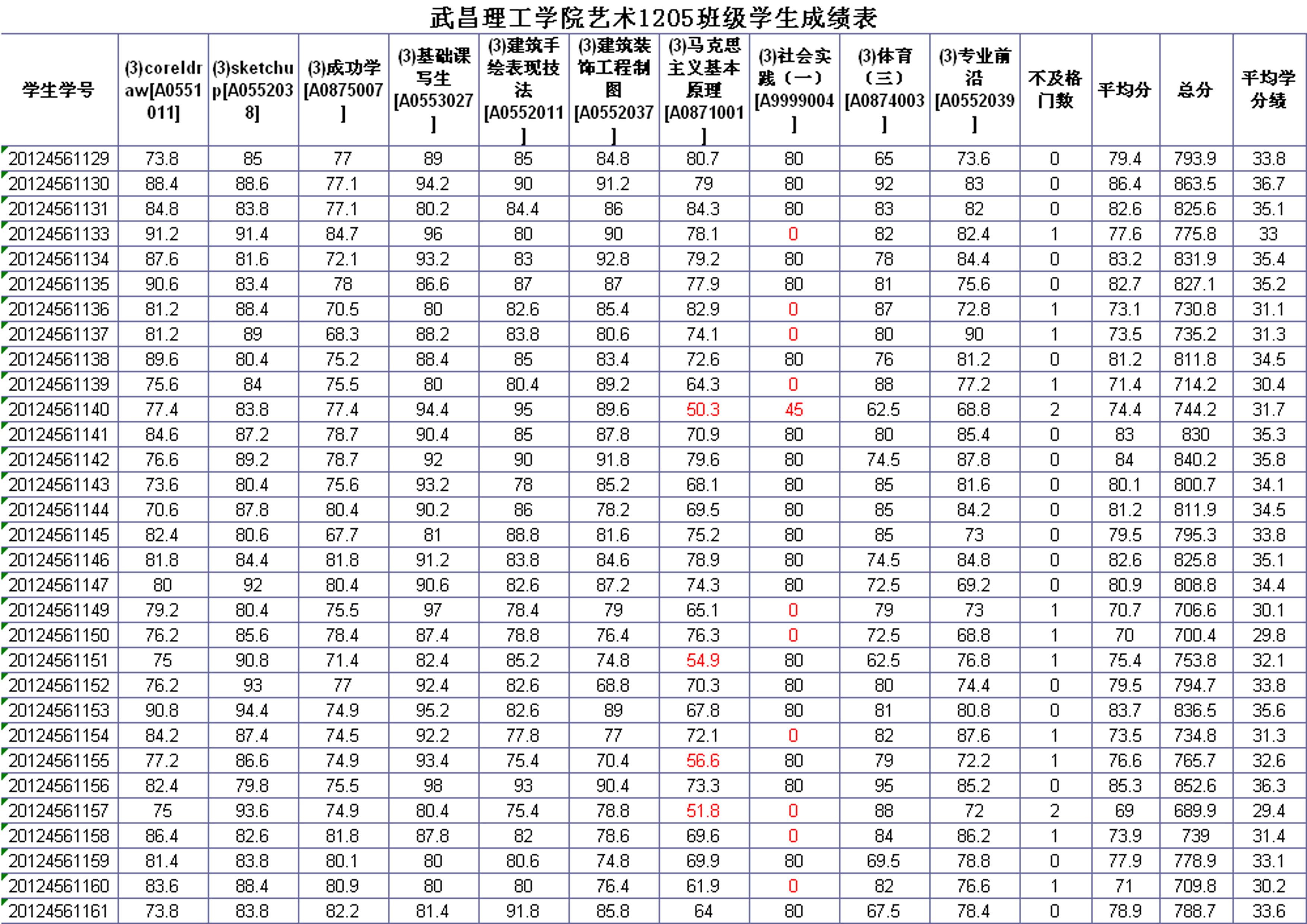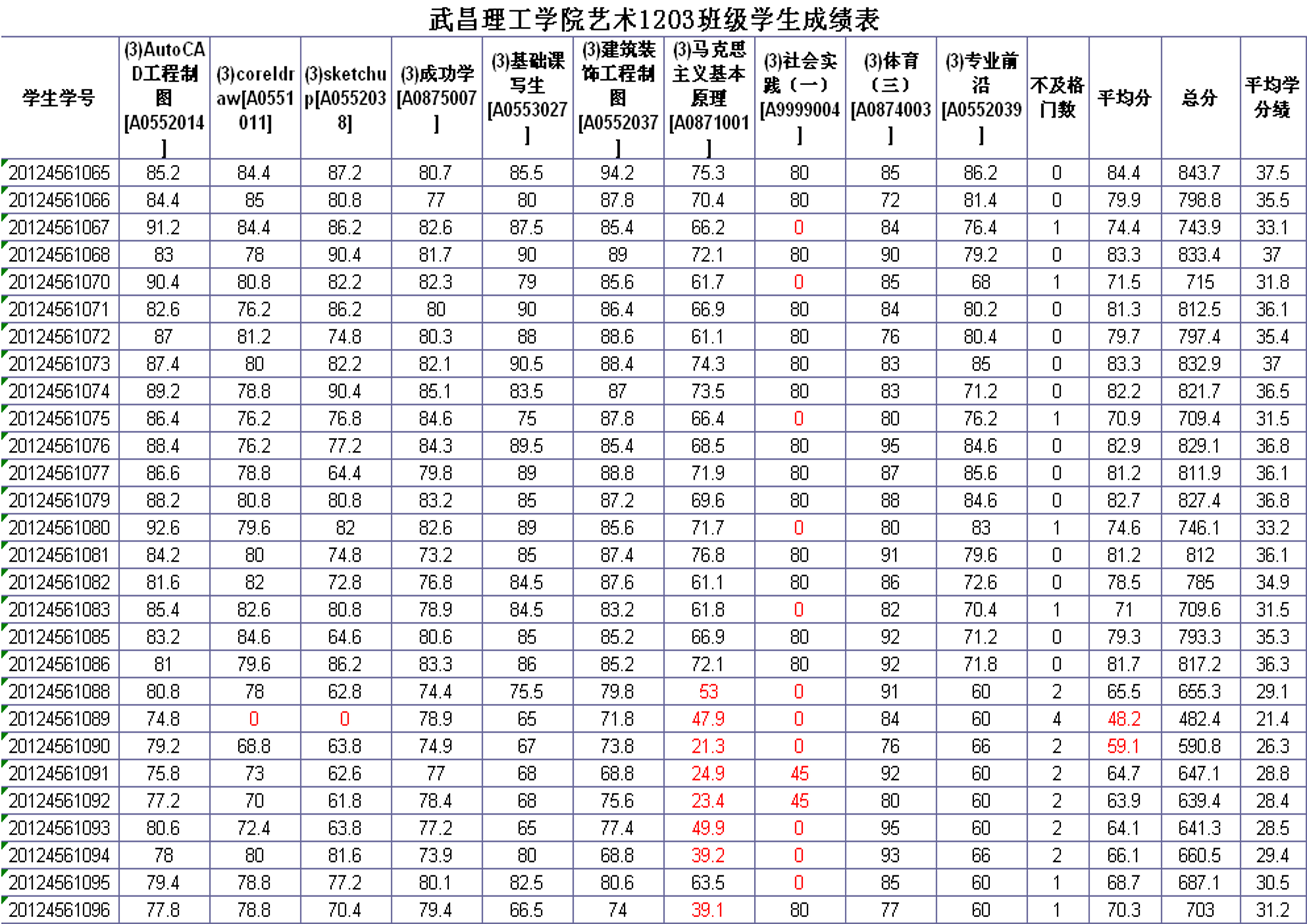 艺术设计学院2013-2014学年度第一学期2012级各专业班级考试成绩