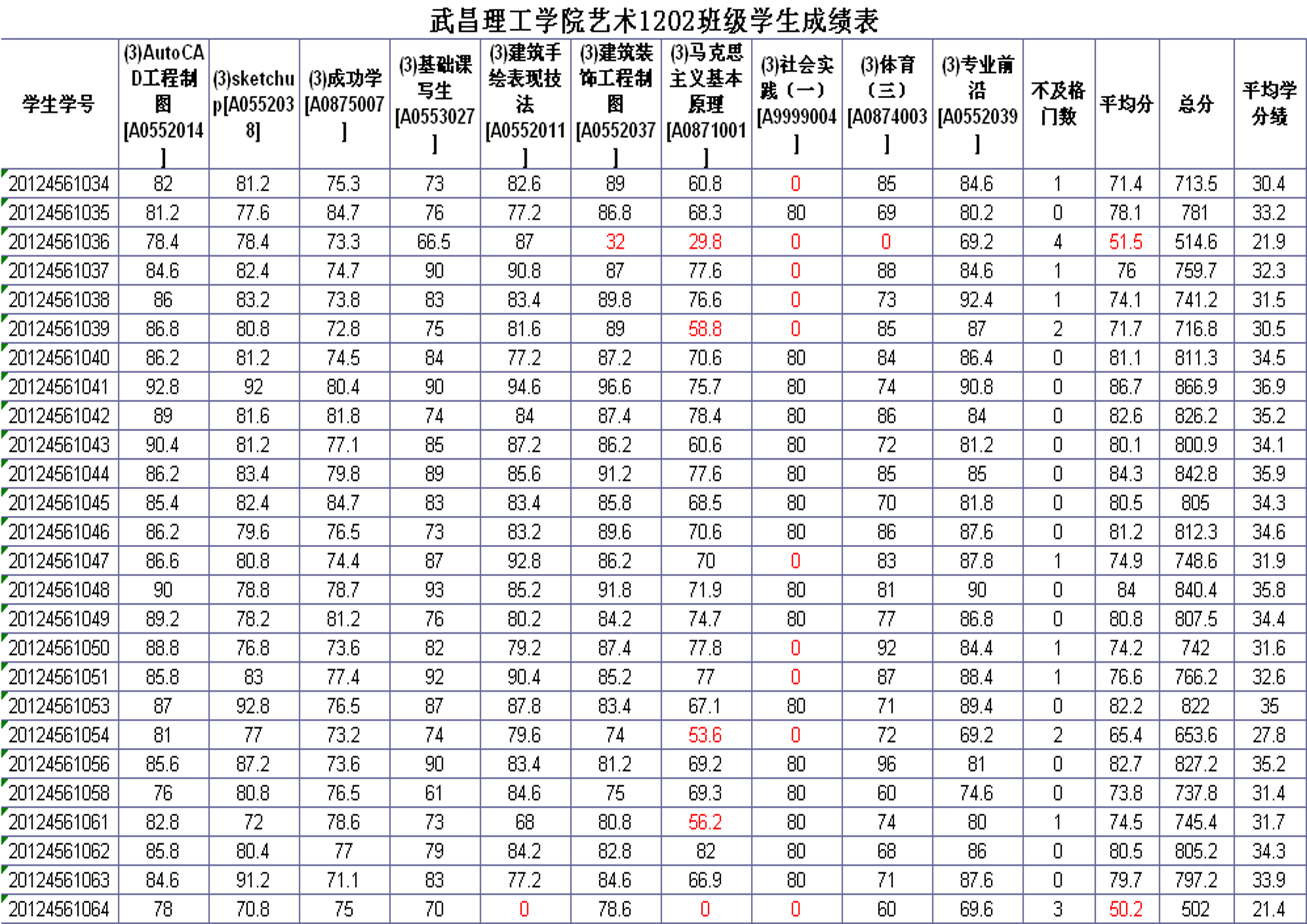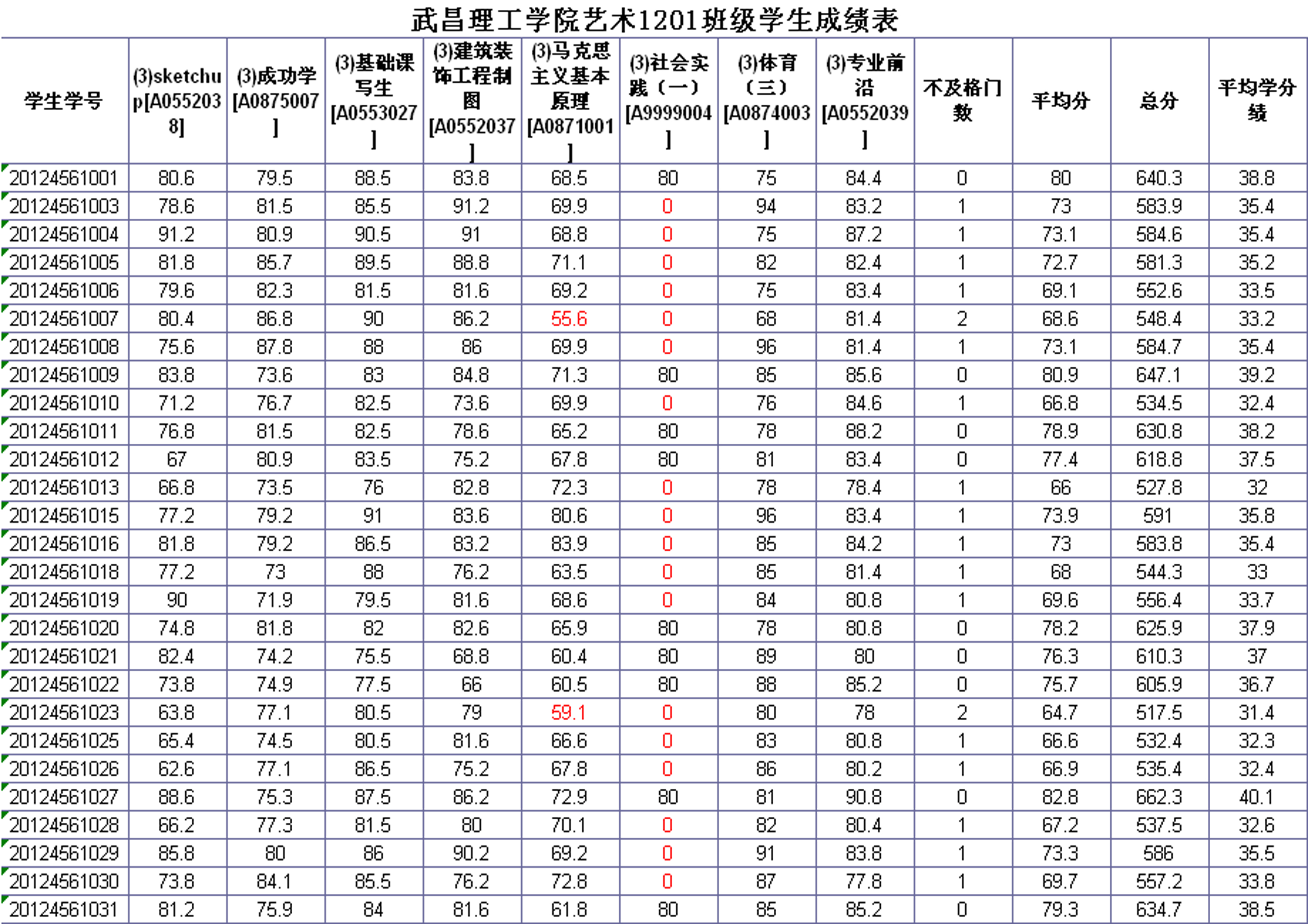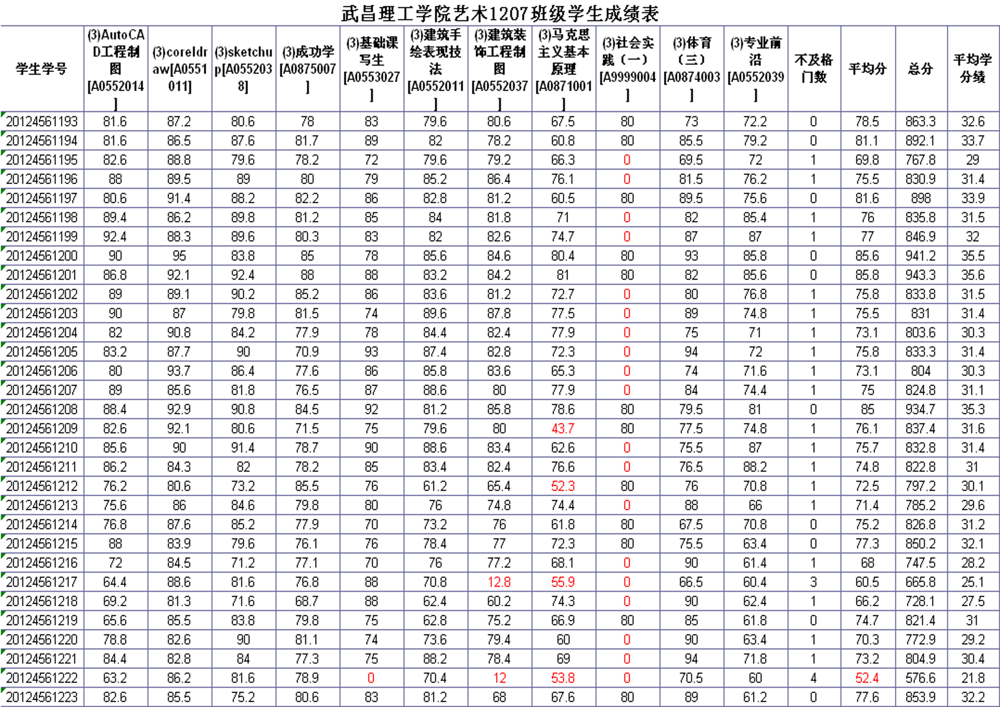 艺术设计学院2013-2014学年度第一学期2012级各专业班级考试成绩
