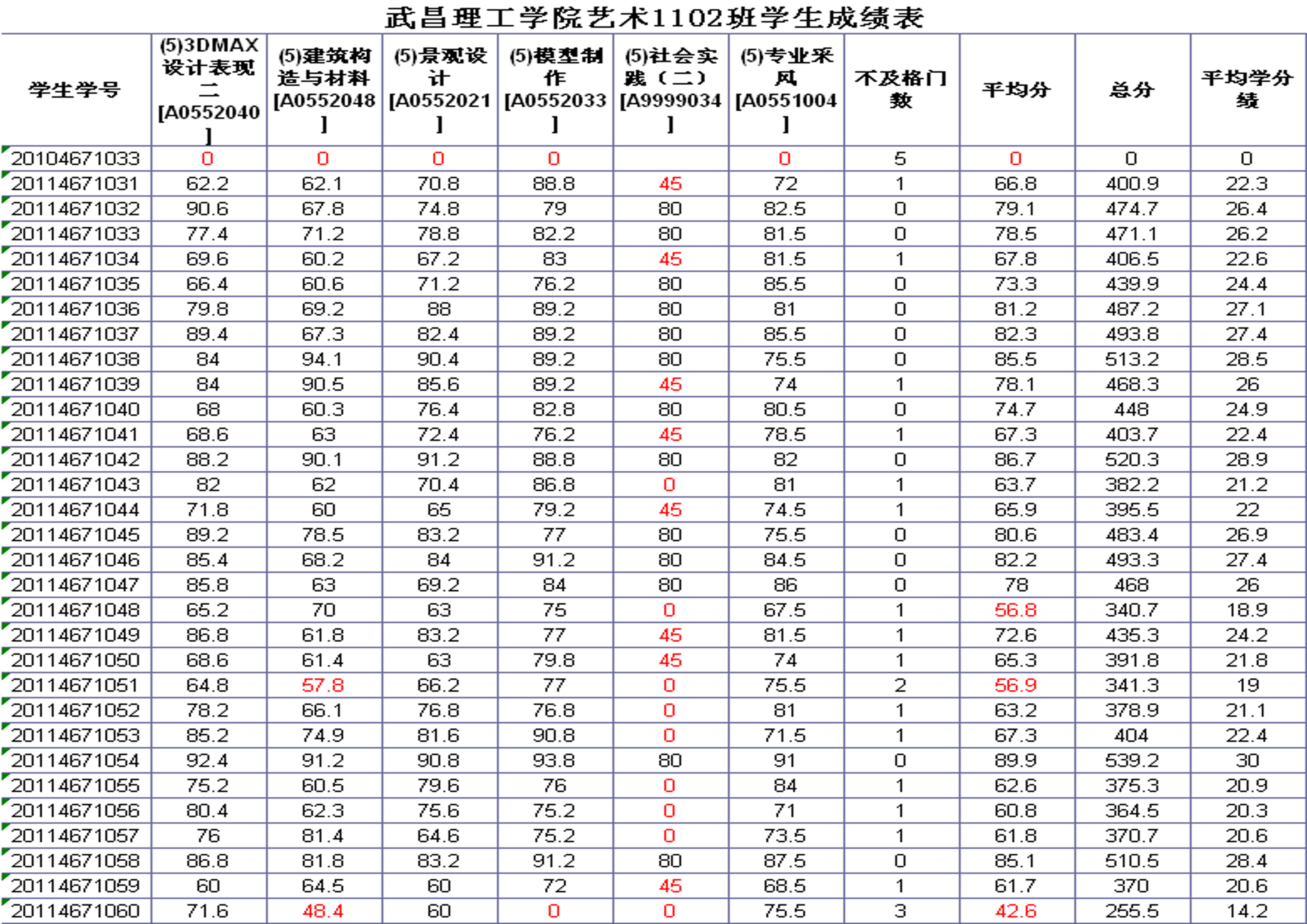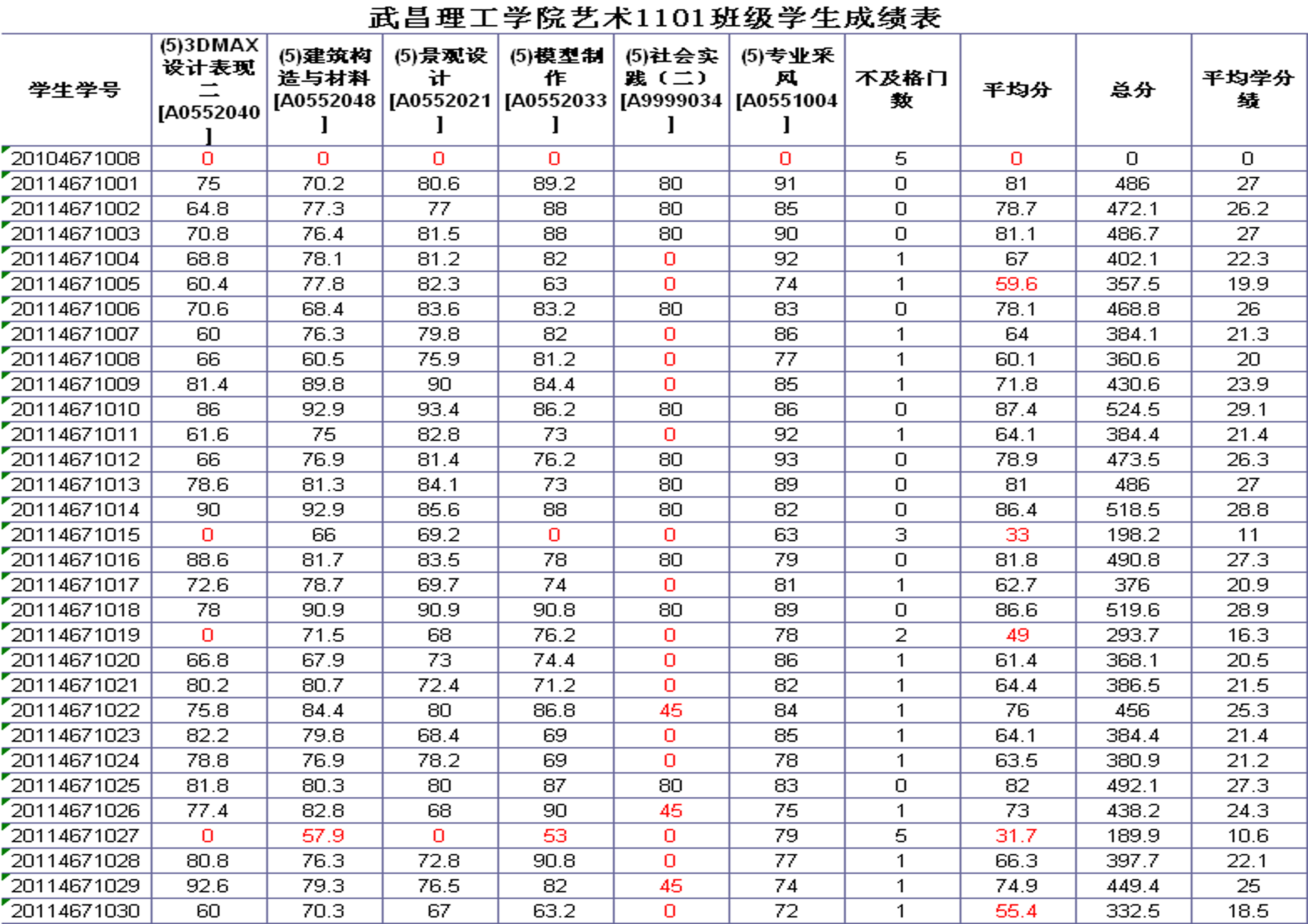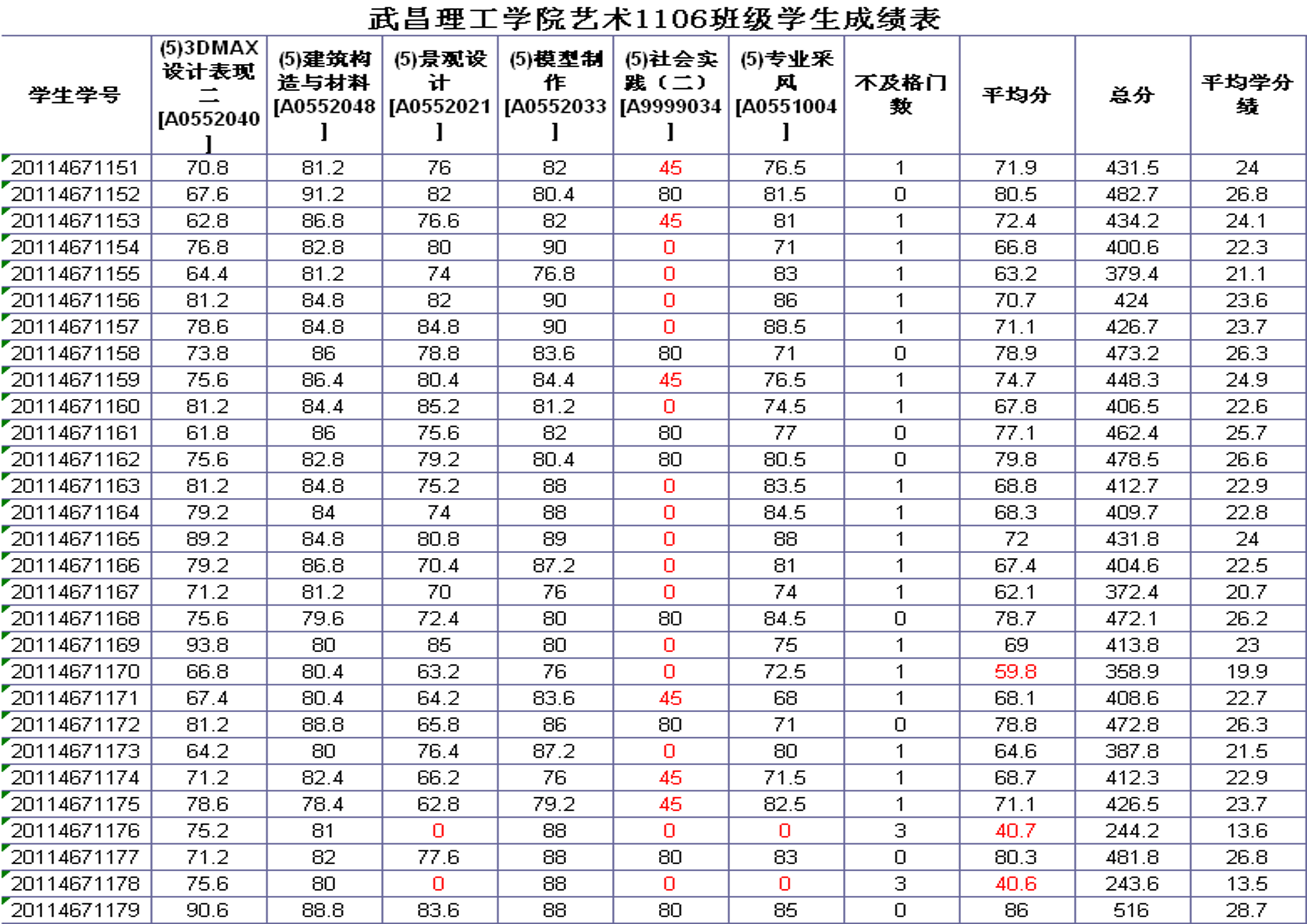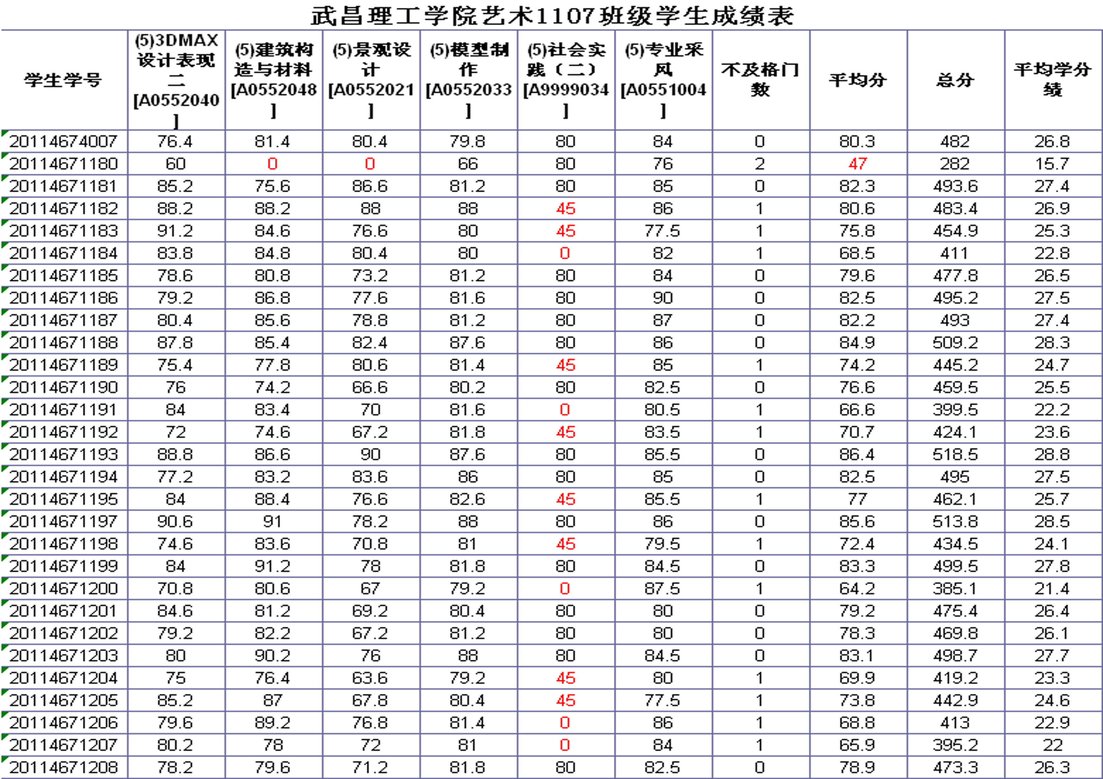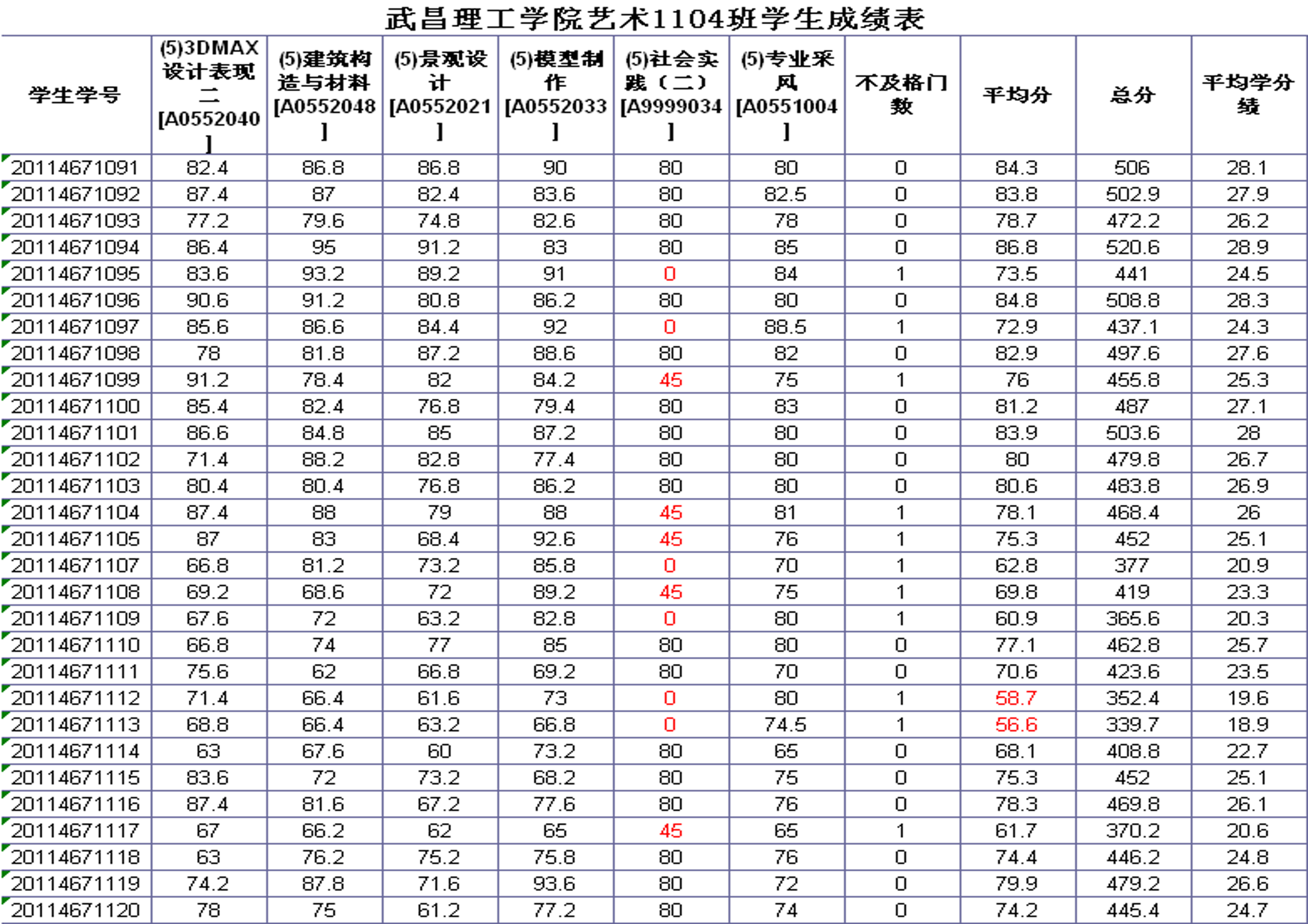 艺术设计学院2013-2014学年度第一学期2011级各专业班级考试成绩
