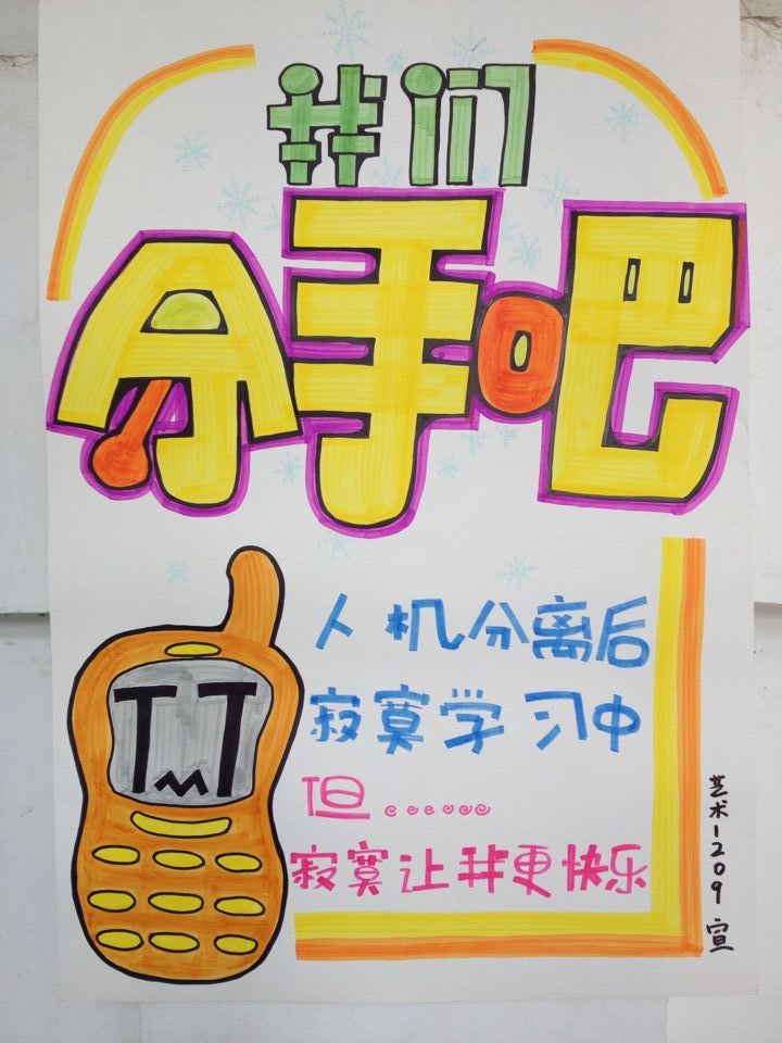“我们分手吧!”、“微笑离机,高效学习”、“人机分离消灭低头族”……近日,细心的同学发现,在太阳集团2138教学楼、宿舍、食堂等多个地方张贴着一幅幅生动形象的POP宣传海报,海报的内容均为该校正在推行的课堂“人机分离”管理制度。这些POP海报是该校艺术设计学院武钢老师指导艺术1208、1209班学生利用所学,集体创作的设计作品。
