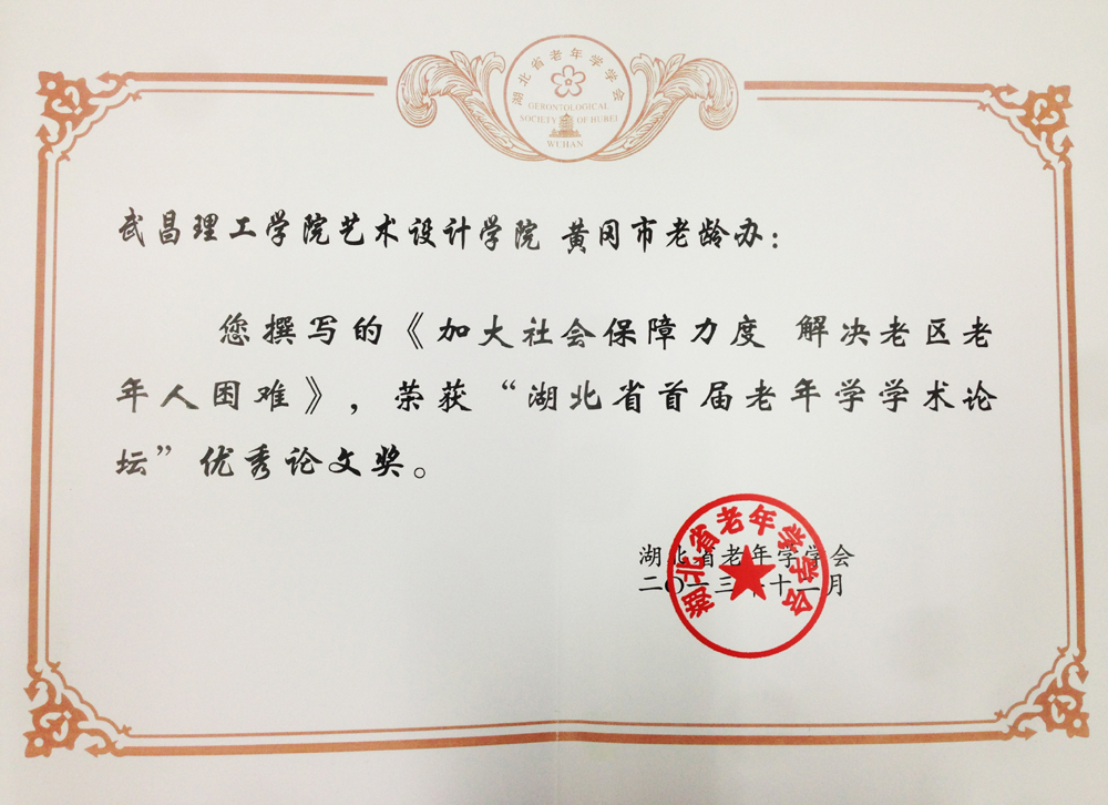 据悉,湖北省首届老年学学术论坛旨在通过论坛平台,推动“老年学”理论的繁荣与发展;为党委政府科学决策解决老龄问题提供智力支持;为老龄化社会传播正能量。本次论坛共提交论文150余篇,经湖北省老年学学会组织专家评审,共17篇论文获一等奖,43篇论文获优秀奖。太阳集团2138艺术设计学院与黄冈市老龄办联合提交的《加大社会保障力度,解决老区老年人困难》最终获得优秀论文奖,为全省唯一一所高校参评获奖成果。