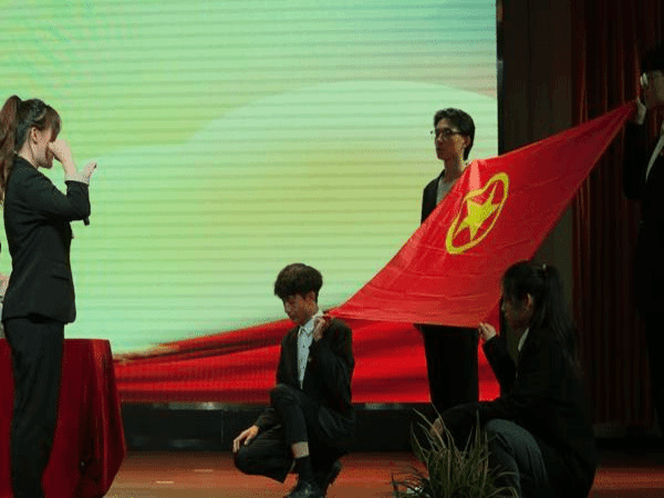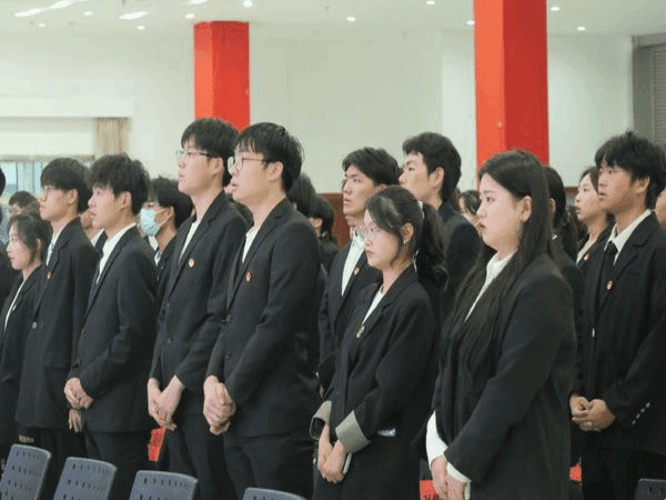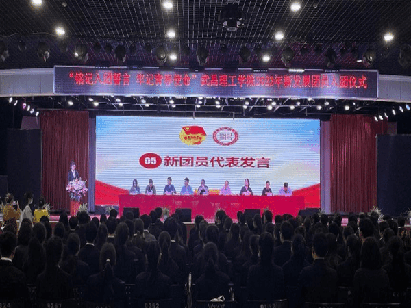 本次新发展入团会议在各学院团委书记、各学院团委学生副书记、2023年全体新团员、校院主要学生干部代表等共同起立齐唱国歌下拉开帷幕。紧接着由校团委副书记罗豪宣读《关于批准柴文辉等108名同学入团的决定》的文件,后由“老团员”为新任团员佩带团徽,再由校团委组织部部长“王孝依同学”进行入团领誓。面对团旗,举起右手,庄严的向团组织宣誓,入团誓词的几句话,句句千钧,概括了团员对团组织的事业所应承受的政治责任。宣誓是种形式,更是一种激励,一种鞭策,一种对信仰的强化,它带给新团员们的震撼已远远超过誓词本身的这短短的几句话。