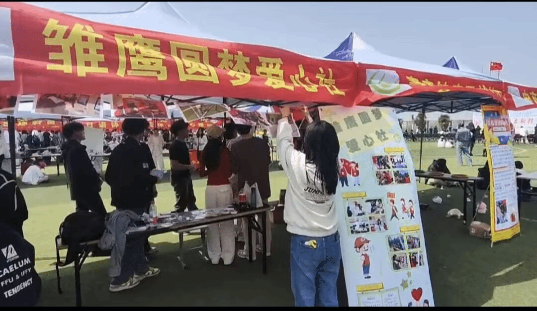 在现场,手工艺品、种子卡片等小礼品,一幅幅精心制作的海报,展示着雏鹰圆梦爱心社过往参与的公益活动,每一张照片都记录着社员们践行公益的坚定脚步。志愿者们身着统一服装,热情地向过往同学介绍社团宗旨,讲解公益项目的实施情况,吸引了众多同学驻足聆听,不少同学报名加入社团,立志为公益事业注入新鲜血液。