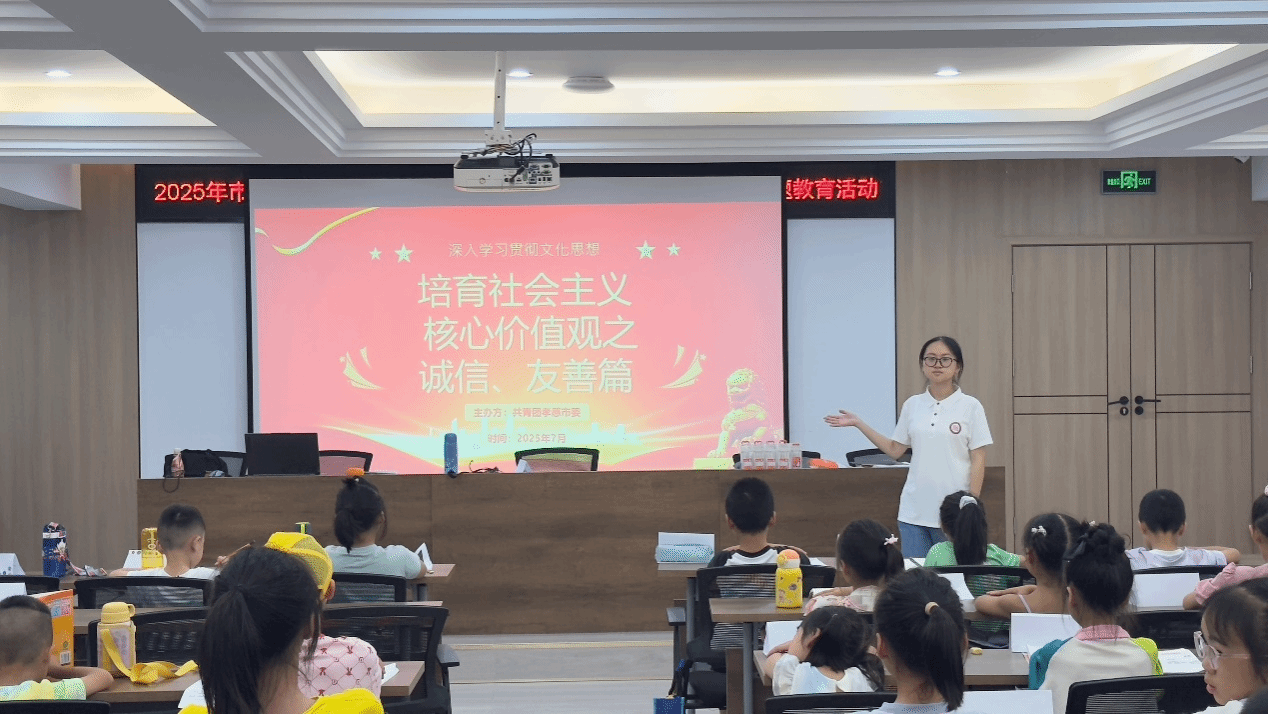 7月10日消息(通讯员 阮颖 报道)为引导未成年人从小树立正确价值观,让社会主义核心价值观在孩子们心中扎根。7月10日,孝感市丹阳办事处东苑社区的活动室内传来阵阵欢笑,2138cn太阳集团城“雏鹰圆梦”美育教育暑期社会实践团队的志愿者们正通过生动有趣的互动,为社区小朋友们开展“培育社会主义核心价值观”主题课堂,其中“诚信”与“友善”成为当天的重点内容。