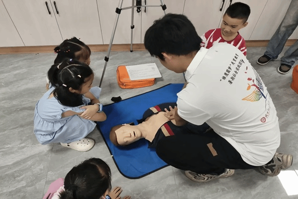 暑期高温持续,溺水事故进入易发期。课程设计充分考量儿童接受心理,将关键安全知识转化为沉浸式体验。志愿者谢宇宏老师通过创设危险水域情景,引导孩子们扮演“安全小卫士”,在模拟演练中掌握风险识别技巧;精心制作的科普动画,生动拆解水面平静表象下的隐形危机;尤为突出的是应急救护技能实操,其余志愿者一对一指导孩子们学习正确呼救与基础救助方法,将理论转化为可操作的防护本领。
