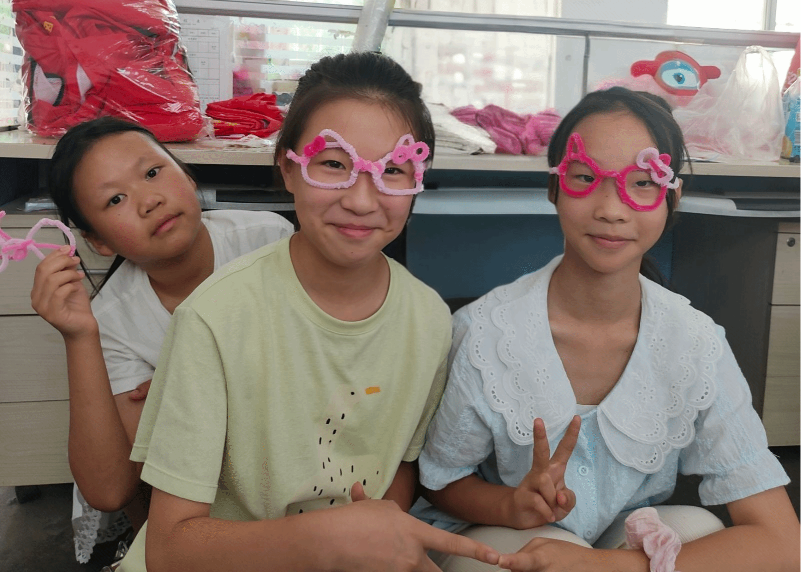 课程开始时,志愿者李张缘现场演示扭扭棒弯折、缠绕的技巧,将原本普通的扭扭棒化为镜架、镜腿和装饰花纹。孩子们紧跟步骤,逐步完成造型。在志愿者李张缘的鼓励下,孩子们融入独特创意——有的为眼镜添加“翅膀”造型,有的用彩色珠子点缀镜框。孩子们戴上亲手制作的眼镜,化身“小小设计师”,互相展示作品并拍照留念。