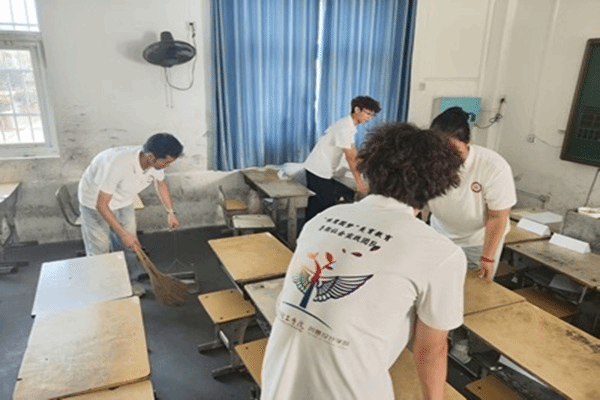为给孩子们营造整洁温馨的学习环境,招生工作结束后,实践团队立刻投入教室卫生清扫与教学布置中。同学们分工明确:有人仔细擦拭门窗桌椅,有人用彩纸剪出“欢迎新同学”的装饰贴,有人在黑板上绘制生动的卡通欢迎画。汗水浸湿了队服,但大家脸上始终洋溢着笑容。