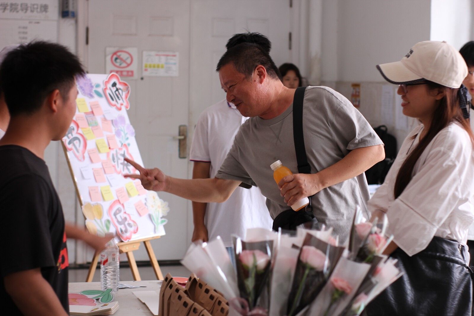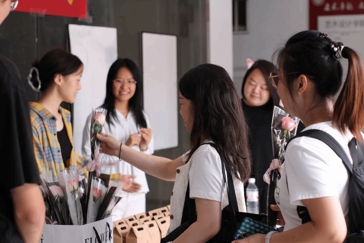 在教师节的前一天,学院学生志愿者早早到位,将点位布置得温馨雅致。鲜艳的康乃馨与创意礼物盒、手绘贺卡整齐摆放,礼物盒上画着学生们精心设计的可爱小图案,贺卡里则满是手写的暖心寄语,每一份礼物都融入了创意设计学子的专业巧思与真挚心意。