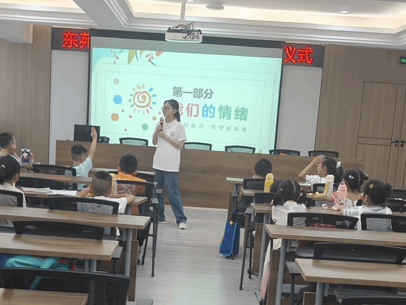 在活动当天,东苑社区的教室里暖意融融。实践团队志愿者以生动的故事导入课程,在提问环节中,孩子们都纷纷举手抢答,课堂瞬间活跃起来了。“当玩具被抢走时,会感到生气;得到表扬时,心里会甜甜的,这写感受就是情绪哦!”志愿者用通俗易懂的语言,结合生活场景讲解情绪的产生机制,引导孩子们认识“喜、怒、哀、惧”等基本情绪,以及不同情绪背后的环境诱因时,应该如何适当的调整。