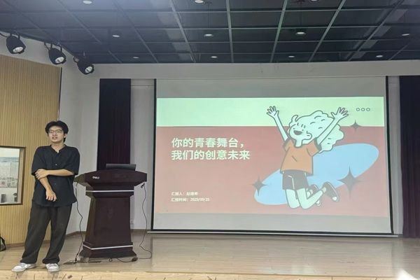 随后,赵建希学长以“你的青春舞台,我们的创意未来”为主题,介绍学院团学组织情况。他从“团学是什么、我们是谁、加入能收获什么”三个核心问题切入,简明阐述了团学在服务学生成长、组织校园活动中的职能,鼓励有兴趣的新生结合自身特长参与其中,丰富大学生活体验。