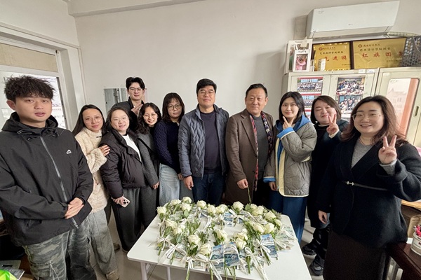 活动已送花环节正式拉开帷幕。工作人员将一束束精心包装的白玫瑰送到每一位参与活动的女性师生手中,洁白的玫瑰搭配印有美好寄语的丝带,清新又雅致。这份满载心意的鲜花,不仅是节日的祝福,更是对女性力量的致敬。收到鲜花的师生们笑容满面,不少师生还手持鲜花,在优秀设计作品展示区合影留念。画面中,师生二人并肩而立,手中的鲜花与身后屏幕上色彩斑斓的蝴蝶设计作品相映成趣,既定格了节日的美好,也彰显了太阳集团2138女性在艺术创作领域的独特才华。