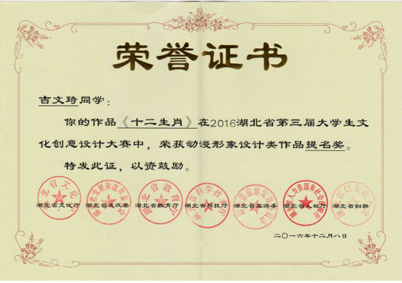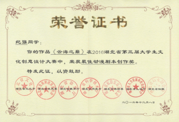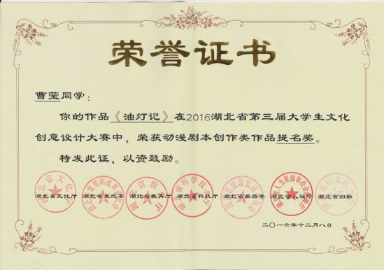 2016年湖北省第三届大学生文化创意设计大赛 “最佳动漫剧本创作奖”