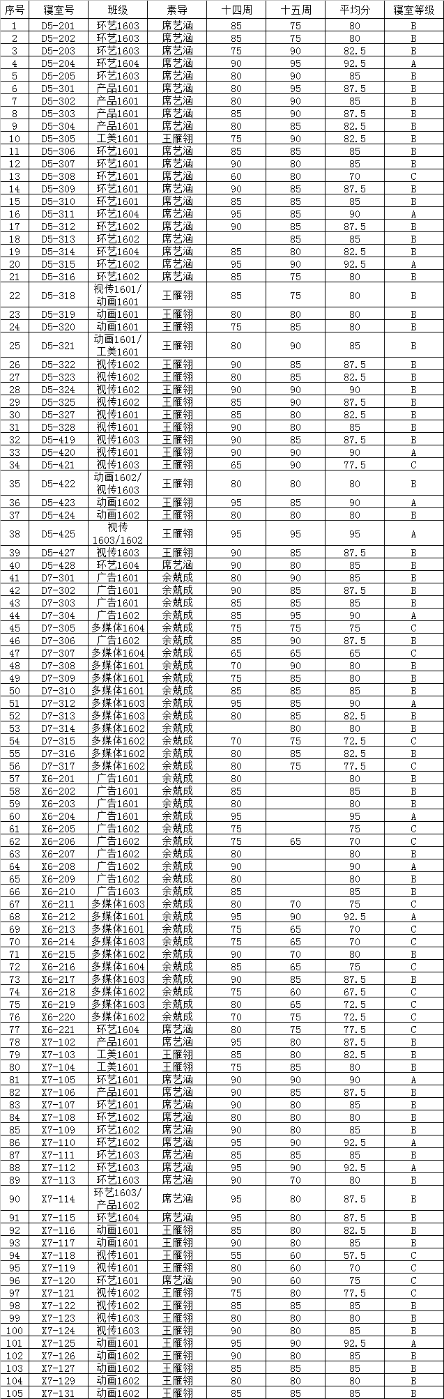 2016-2017学年第一学期十二月达标寝室建设结果
