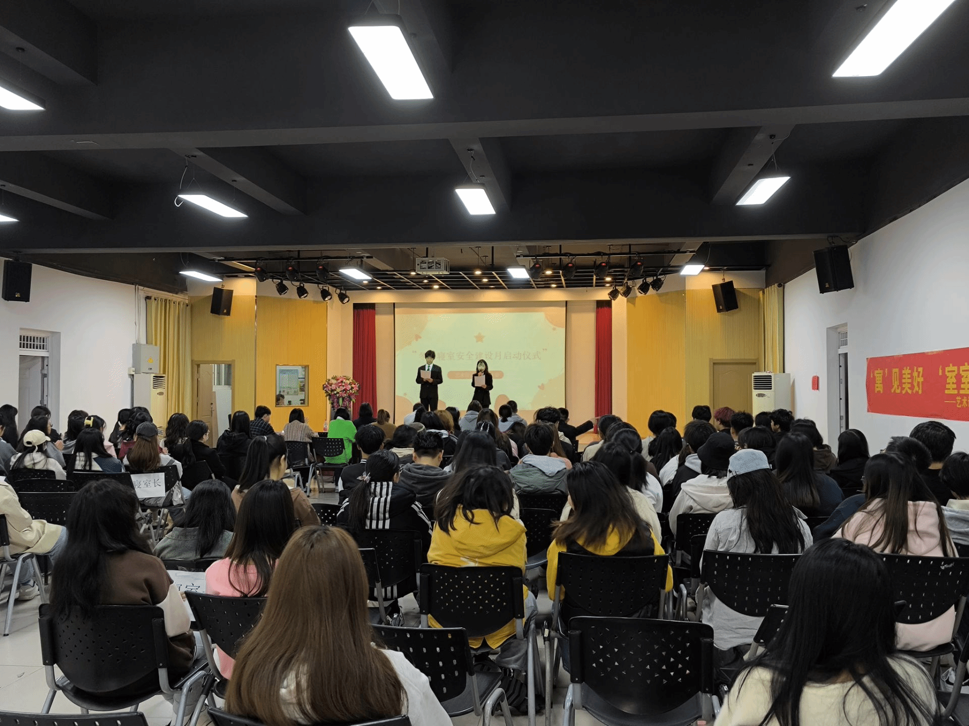 此次活动分别由艺术设计学院党总支书记高松、党总支副书记兼包保楼栋长李婷、老师楼层长、学生楼层长……做演讲,演讲内容主要包括四个方面:宿舍卫生安全、宿舍消防安全、宿舍财务安全、宿舍人际安全。造成宿舍安全隐患是违规电器,在寝室里,同学们要有安全意识,不私接电源或使用高功率电器电源、电热毯、卷发棒……违禁物品,和谐是建设文明宿舍的第一步,只有相亲相爱,才能走过春夏秋冬,只有互帮互助才能共创文明寝室。寝室长是宿舍的中间人,寝室长要履行自己的义务和职责,当同学们之间有矛盾时,要及时调解,同时也要监督宿舍成员的卫生情况和作息情况,寝室如有损坏的物品要找宿管员进行维修,当同学们矛盾激烈无法调解时,要上报素质导师。文明寝室由大家建设,只有舍我才能成就大我。