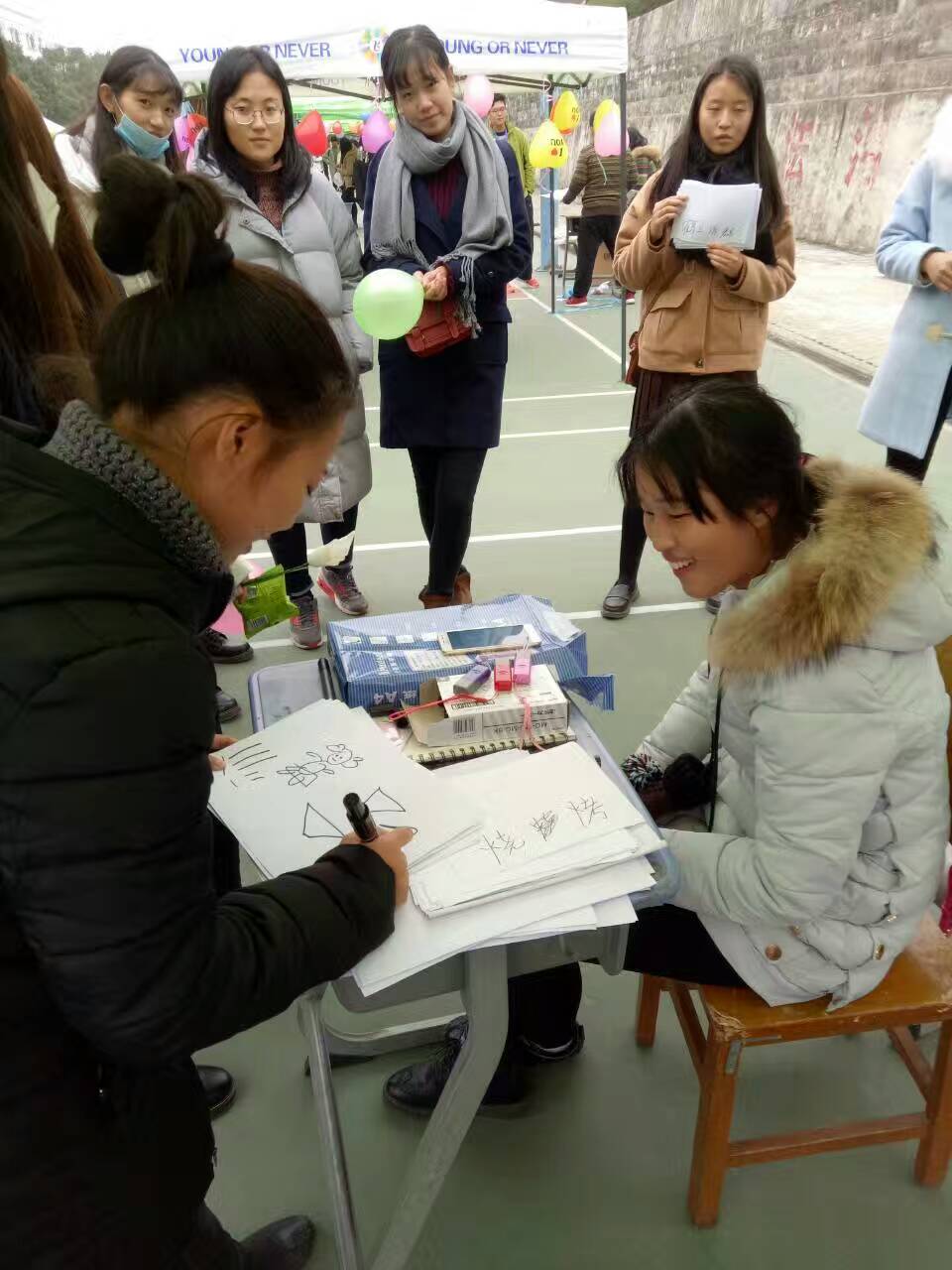 2.2016年11月25日于西区篮球场开展活动。游戏题目为“你画我猜”两人或三人一组,一人画其余人来猜,在规定的两分钟以内,根据才出来的多少来给他们评分。