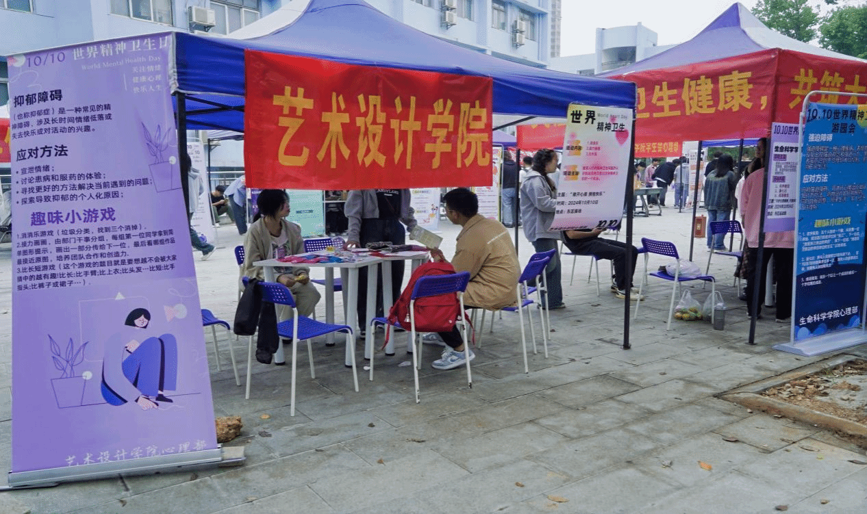 10月10日消息(通讯员 王树洋 报道)“第七届世界精神卫生日”活动由校心理中心与我院心理部以及组织部的协助,于10月10日至10月14日隆重展开。活动期间,艺术设计学院将围绕“敞开心扉 拥抱快乐”的核心理念,推出一系列丰富多彩、寓意深远的内容,活动现场气氛热烈,吸引了众多同学前来参与。活动现场设置了多个主题区域,内容丰富多样。在心理健康知识展览区,摆放着精心制作的展板,通过生动的图片、简洁的文字,深入浅出地介绍了常见心理问题的表现、成因以及应对方法。不少参与者驻足观看,不时与身边干事的交流,对心理健康有了更清晰的认识。现场还设置了心理测试区和趣味互动游戏环节。通过心理测试,参与者可以更好地了解自己的心理状况,发现潜在的问题。趣味互动游戏则在轻松愉快的氛围中,帮助人们缓解压力,增进人际关系,提高团队合作能力。