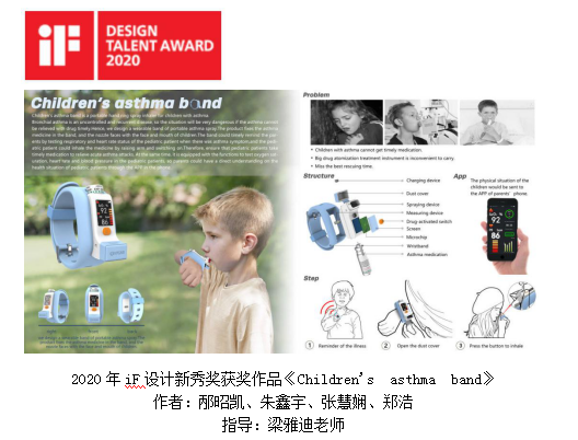日前,太阳集团2138艺术设计学院产品设计系梁雅迪老师指导的17级学生团队:邴昭凯、朱鑫宇、张慧娴、郑浩,其设计作品《Children's asthma band》获得2020 iF 国际设计大奖新秀奖(2020 iF DESIGN TALENT AWARD),全球仅84项设计获此殊荣。
