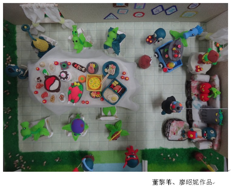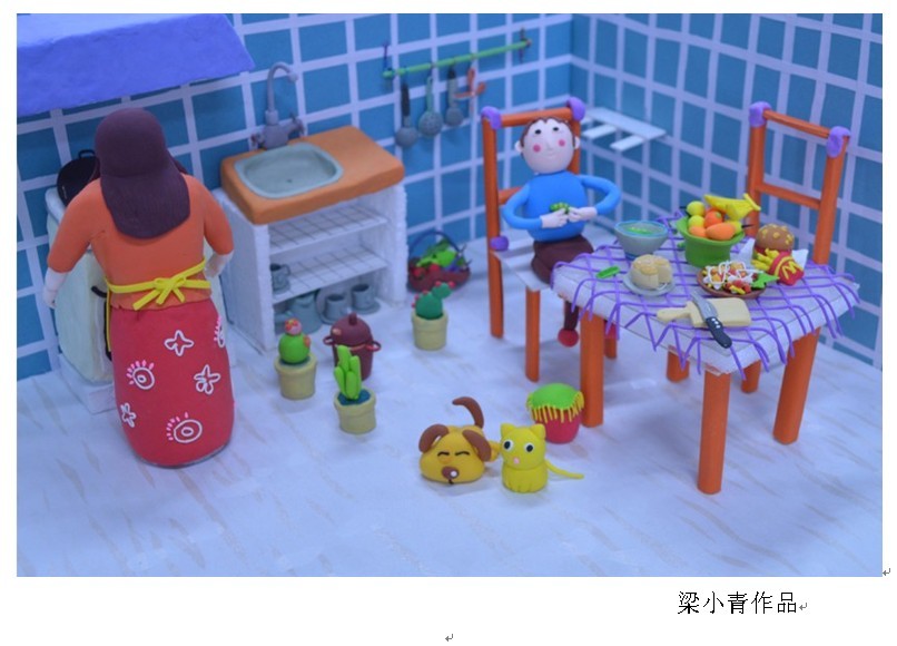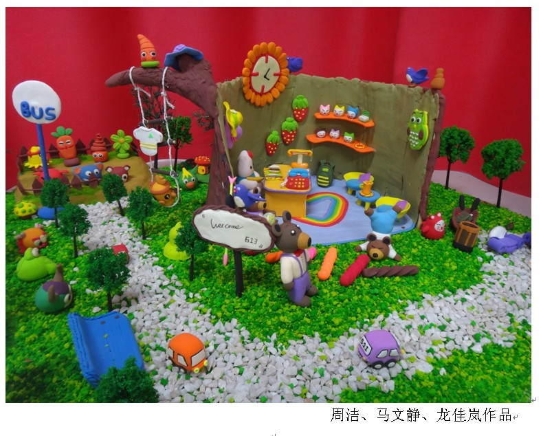 下面是学生根据喜爱的动画片、游戏或生活中的场景为蓝本,做的立体造型作品。