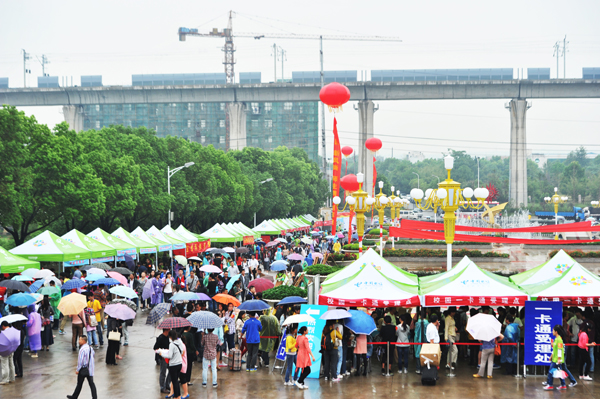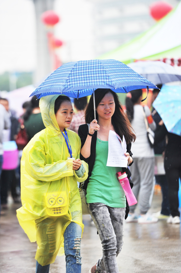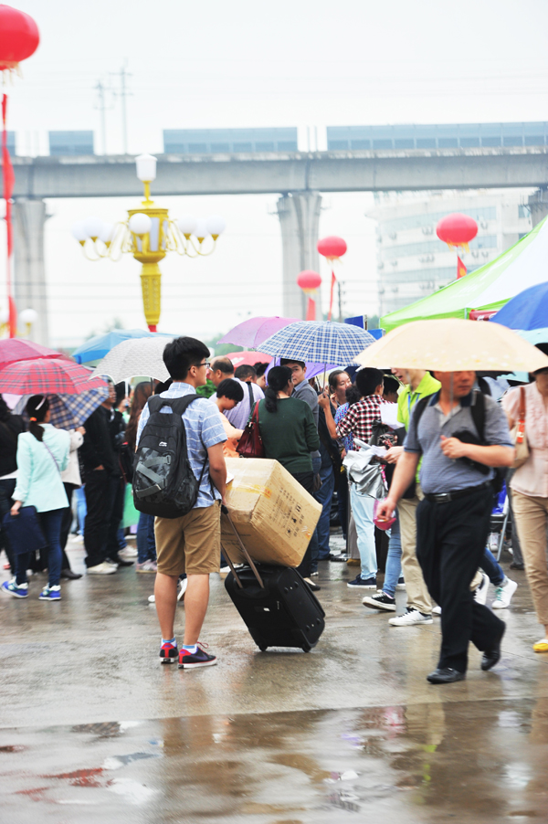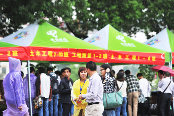 虽天公不作美,天空飘起了细雨,但丝毫没有影响到新生报到的热情和迎新志愿者工作的热情。在成功广场旁的迎新点,标有各个学院名称的迎新站点整齐排开,师生们用亲切的笑容欢迎2013级新同学。
