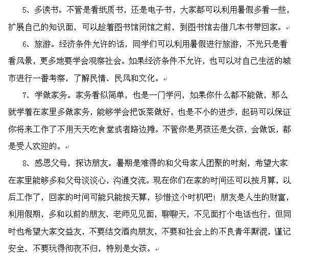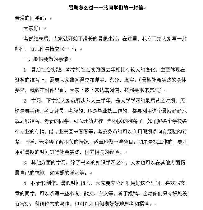 在信中,刘玲莉老师针对暑期要做的事情,给大家提出8点建议:暑期社会实践;学习;其他方面的学习(如驾照的学习等);科研和创作;多读书;旅游;学做家务;感恩父母,探访朋友。刘老师说,“60天的假期,切不可让其平淡地匆匆而去。希望同学们不妨认真分析一下自己的需求,科学规划暑期生活,过一个愉快而充实的暑假,同时也为来年的求职就业作好准备。这样,才能休息、进步两不误,过一个完美暑假!”