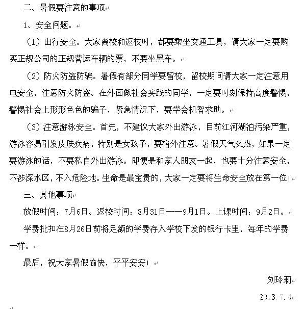 在信中,刘老师还将暑假要注意的事项尤其是安全问题进行了交代,提醒同学们注意出行安全、防火防盗防骗、注意游泳安全等。“暑假有部分同学要留校,留校期间请大家一定注意用电安全,注意防火防盗。在外面做社会实践的同学,一定要时刻保持高度警惕,警惕社会上形形色色的骗子,紧急情况下,要学会机智求助。”