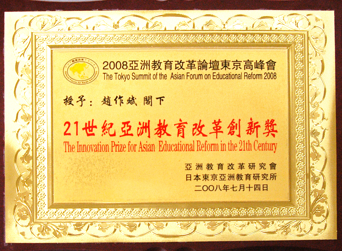 ¨ 2008年亚洲教育改革研究会、日本东京亚洲教育研究所授予校长赵作斌教授“21世纪亚洲教育改革创新奖”