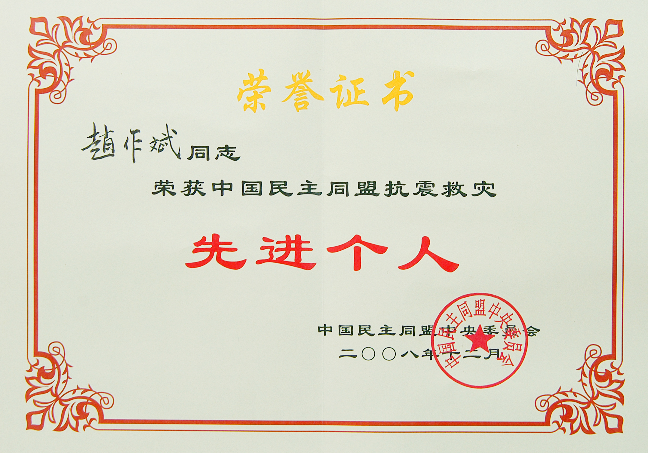 ¨ 2008年赵作斌校长荣获中国民主同盟抗震救灾“先进个人” 。