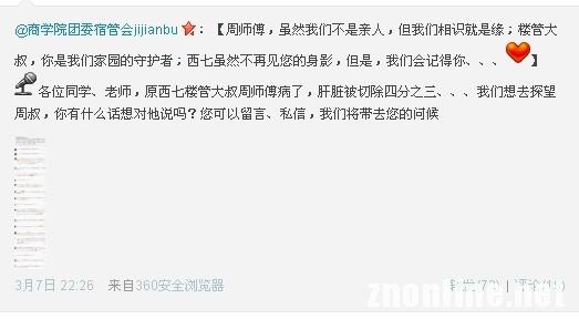 据记者了解,这学期开学时,已经有不少住在西7的同学发现宿舍的楼管大叔换了,很多同学都追问原来的楼管大叔周师傅被调往哪栋宿舍,这才发现,原来周师傅患了重病,寒假不久就住院了,肝脏被切除了四分之三。得知到这个消息,同学们的心都异常沉重。于是有不少学生,学校组织,老师们都自发发微博祝福,为周师傅祈祷。