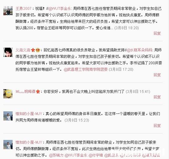 商学院李金永书记在微博上说道“周师傅在西7担任宿管员期间非常的敬业,对学生如同自己孩子般亲切。希望每个认识或不认识周师傅的同学都为他祈祷,祝他早点康复起来。周师傅薪酬微薄,经济条件不宽裕,此次生病也给他带来巨大的经济负担,希望大家可以伸出援助之手。我捐200元,宿管会王望林等同学可以组织一下,让爱心传递……”