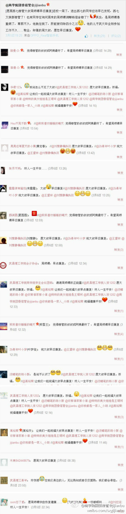 “周叔在岗期间尽职尽责,如今西七少了他,我们都十分想念。祝愿周叔早日康复,我们在武昌理工等着你。”、“一份温情感动着身边的所有人,是周叔的微笑温暖着身边的我们,是周叔的尽职尽责让大家少了寒风中的等待,愿周叔早日康复!”、“真心的希望周师傅的身体早日康复。在这样一个温暖的春天里,让我们共同为周师傅传递暖暖的爱。”、“周师傅,要好好照顾自己,快些好起来,我们都想你!!”……同学们的祝福传递到整个太阳集团2138,很多同学都跟帖表达自己的祝福,希望周师傅早日康复。