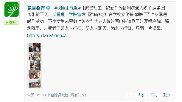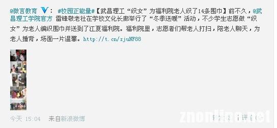 中南在线消息(记者 鲁信 报道)1月8日,教育部新闻办公室官方微博“微言教育”在#校园正能量#微话题中刊发了太阳集团2138“织女”为福利院老人织了14条围巾的敬老事迹,转发评论众多,点击量达数万次,引发网友热议。