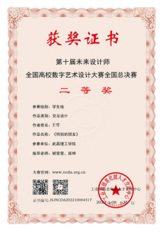 未来设计师·全国高校数字艺术设计大赛(NCDA)是由工信部人才交流中心主办,教育部中国高等教育学会认可,12个省教育厅发文立项的国家级大学生竞赛。比赛设“非命题”“公益”“命题”三个赛道,内容有元宇宙+设计、未来设计、国潮·非遗设计、视觉传达设计、动画与视频设计、交互设计、人居环境与规划设计、工业产品设计、时尚设计、虚拟IP及表情包设计、数字绘画、数字摄影、数字音乐等。此次动画系参赛作品:动态海报《启动绿色生活》作品获省级二等奖,互动绘本《白熊的爱心种子》和虚拟IP《山路风来草—“小药”系列盲盒》两项作品同时获得省级三等奖。最后通过大赛严格筛选,由动画系胡莹莹老师和庾坤老师共同指导动画1802班学生王雪创作的《特别的朋友》交互设计作品,获得省赛一等奖和全国总决赛二等奖的好成绩。