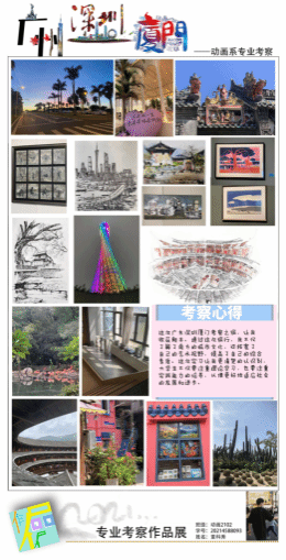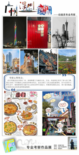 2023年动画系专业考察途经广州、深圳和厦门三个城市,本次考察不仅是同学们知识积累的呈现,更是对城市文化之美的发现与记录,同学们创作的艺术作品如色彩缤纷的琉璃,让我们从中感受到每个城市独特的文化艺术气息,汇报展以“琉光艺彩”为主题,描绘同学们在这段艺术之行中记录的精彩瞬间,向观众展示动画系同学们的创造力和艺术才华。在广州,同学们捕捉到了这座古老城市的历史与现代的交融之美,他们用绚丽的色彩和独特的线条描绘出广州的繁华市场、传统建筑和闪烁的夜景,展现了这座城市的活力与多样化。在深圳,同学们通过绘画和摄影,呈现了深圳的高楼大厦、科技园区和充满创意的文化艺术场所,展现出深圳作为现代化发展引领者的独特魅力。他们深入了解了深圳作为科技与文化交汇的城市,并将这种魅力展现在作品创作中。而厦门,则带给同学们绚烂的海洋之光。他们用色彩丰富的画笔勾勒出厦门的海滩、渔港和岛屿,展示了这座城市特有的海洋文化与风景之美。同学们深深感受到了每个城市独特的韵味与生活氛围,并运用插画、当地风貌图片、手绘等多种表现手法,记录下每个城市的璀璨之处,将令人瞩目的城市之美描绘得如琉璃一般晶莹剔透,闪烁着独特的光芒。此次考察不仅加深了学生们对不同城市文化的了解,更塑造了他们对美感的独特见解,让我们一同来领略这场璀璨的艺术之旅吧!