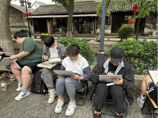 随后,学生们前往了南浔古镇。南浔古镇位于湖州市南浔区,地处江浙两省交界处。明清时期为江南蚕丝名镇,是一个人文资源充足、中西建筑合璧的江南古镇。这里的人文资源丰富,中西建筑合璧,为学生们提供了丰富的创作素材。南浔古镇的美丽景色和深厚的文化底蕴,激发了学生们无限的创作灵感。