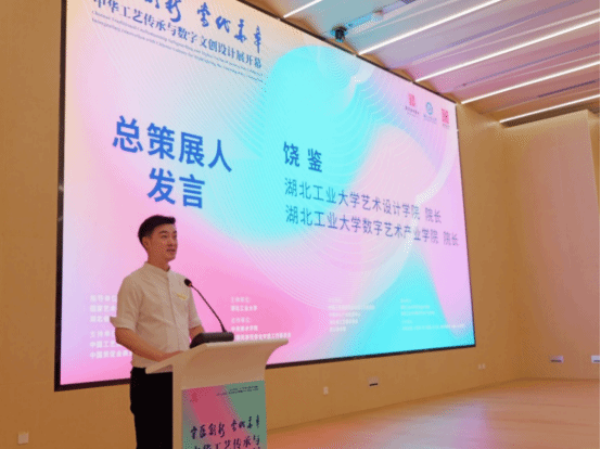 本次展览策展人、湖北工业大学艺术设计学院院长、数字产业学院院长饶鉴教授在致辞中说到:面对数字技术的迅猛发展,相比人工智能的技术替代,手工艺更显得弥足珍贵。过去四十余年,中国经历了巨大的变化,但手工艺的创新步伐并未完全赶上国家的发展速度。在我们征集展品的过程中,我们既看到前辈艺术家在恢复传统工艺上的呕心沥血,也看到年轻艺术家,运用材料创新、数字赋能砥砺前行。这次展览让我们看到了参展艺术家在新时代不断探索与尝试的“守正”,看到了中华工艺的塑造技艺和文化融合的“创新”。这次展览,我们不仅致敬过去,更开启对未来的向往。让陈列在广阔大地上的传统工艺、书写在古籍里的文字活起来,让文脉传承弦歌不辍、历久弥新。希望此次展览能成为一个启示,激发更丰富的“守正创新”,谱写更灿烂的“当代华章”。