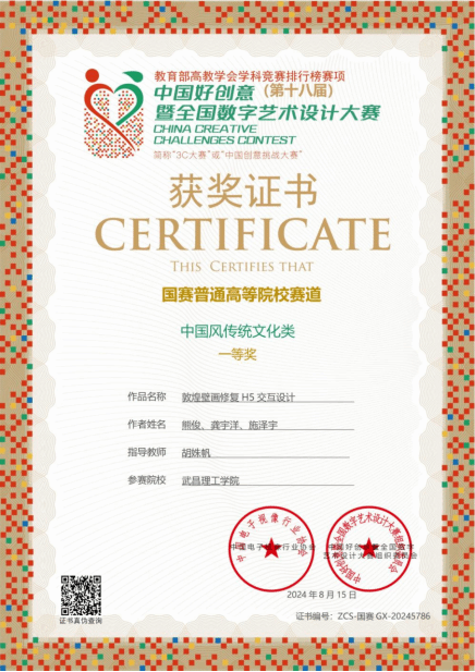 近日,我校艺术设计学院视觉传达设计系再传佳讯!熊俊、龚宇洋、施泽宇三名同学凭借其作品《敦煌壁画修复H5交互设计》在激烈的“2024年中国好创意暨全国数字艺术设计大赛”中斩获国家级一等奖优异成绩。