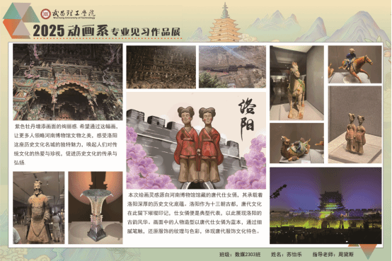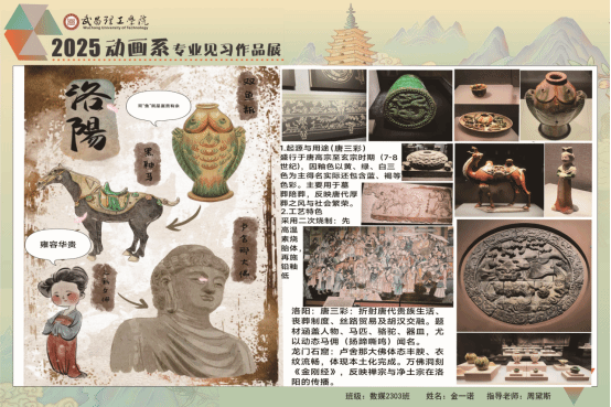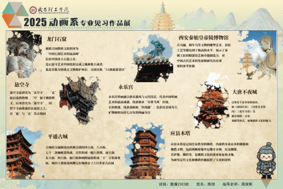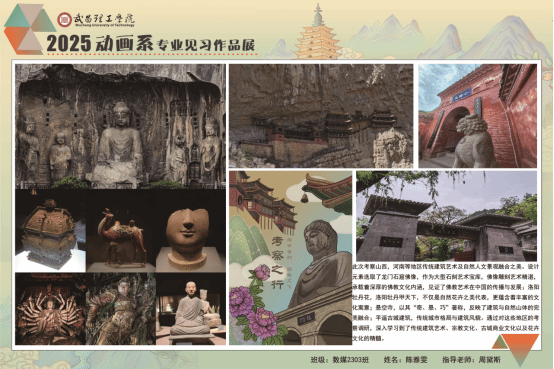 此次见习创作展生动展现了学生们在考察过程中的深刻感悟。他们巧妙地将传统文化与现代艺术相融合,创作出一系列既具创新性又富有艺术审美的作品。在这场古都文化考察中,洛阳这座古都以其深厚的文化底蕴和丰富的历史遗迹,成为学生们汲取灵感的重要源泉。在龙门石窟,学生们深入领略了中国石刻艺术的博大精深,那些历经岁月雕琢的佛像与石刻,仿佛在诉说着千年的故事,为学生们提供了无尽的创作灵感。在应县木塔,学生们惊叹于其独特的木结构和精湛的建筑工艺,深刻感受到中国古代建筑的智慧与魅力。他们通过拍摄和记录,深入了解木塔的建筑特点与历史价值,这些珍贵的素材为后续的创作奠定了坚实基础。而在永乐宫,学生们更是被那世界绘画史上群像构图的顶峰之作——《朝元图》所震撼。他们在深度调研壁画艺术的过程中,仿佛穿越时空,与古代绘画大师进行了一场灵魂对话,深刻感受到古代绘画艺术的无穷魅力。山西青铜博物馆的参观则让学生们对山西地区丰富的青铜文化有了全面而深入的了解。博物馆通过基本陈列、教育互动、数字青铜、临时展览和文创空间等五个展览服务体系,全方位展示了青铜文化的独特魅力。学生们不仅欣赏到了精美的青铜文物,更了解到现代文创设计如何与传统文化巧妙结合,为他们的创作提供了全新的思路与视角。在洛邑古城,学生们亲眼见证了科技创新与传统文化的完美融合。古城内,现代科技手段被巧妙运用于文化遗产的保护与展示,让古老的文化在新时代焕发出新的生机与活力,也为学生们带来了全新的创作思路与启发。