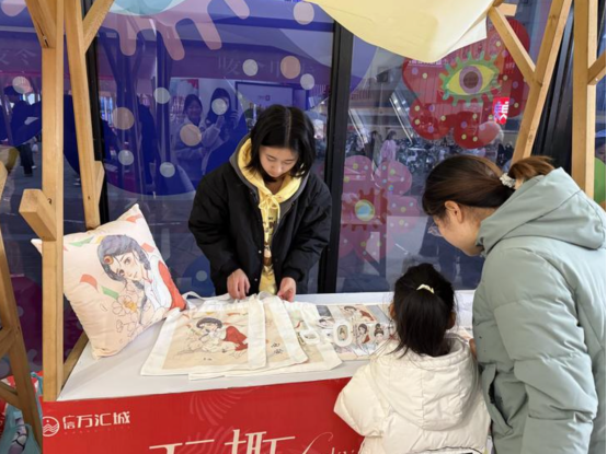 为进一步提升作品的实践价值,让文创成果走出校园、贴近大众,同学们在周五、周六晚间,走进广信万汇城商圈;开办了“丝路回响”文创市集售卖活动。市集现场,同学们精心布置摊位,将文创产品整齐摆放,通过现场讲解、创意演示等方式向市民介绍作品的设计理念与文化内涵。极具特色的文创产品很快吸引了众多市民的目光,不少家长带着孩子前来挑选。同时,视觉传达设计系学生专业社团“原动力创意工坊”也加入到了本次文创市集售卖活动中来,社团展品融合了武昌理工校园文化周边与诸多现代潮流、楚纹样系列装饰产品,引得市民纷纷驻足选购。