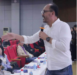 随后,金犊奖评审团主席薛振添以“创意与表达”为题展开主题分享。他巧妙融合经典广告案例、品牌文案与诗歌文本,通过生动解析,深入阐释了视角转换、形式突破与表达创新等创意核心方法论。薛振添以其丰富的行业经验与人文视角,引导师生跳脱思维定式,在审美与叙事中寻找平衡,为在座师生带来了一场兼具专业深度与启发意义的创意对话。