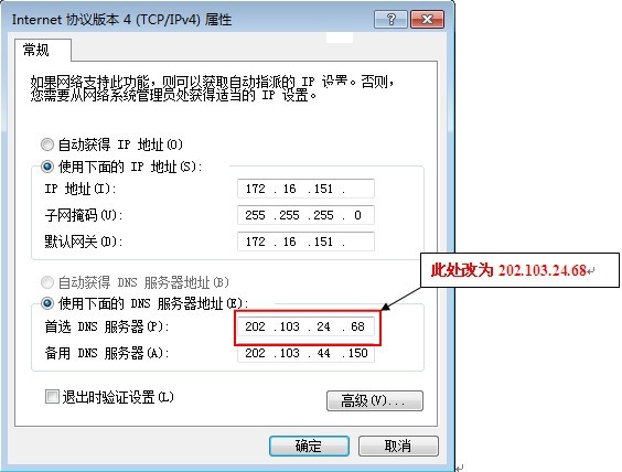 为规范内部上网行为,同时提高网络的稳定性,网络中心近期将对校园内上网的域名解析做相应调整。调整后,原来使用内部解析的服务器取消,原来部分用户的电脑“首选DNS服务器”用的172.16.2.30或10.22.1.13 ,需改为公网电信的服务器地址202.103.24.68,如果原来就没有使用我校内部域名服务器地址的电脑则无需修改。(如图)