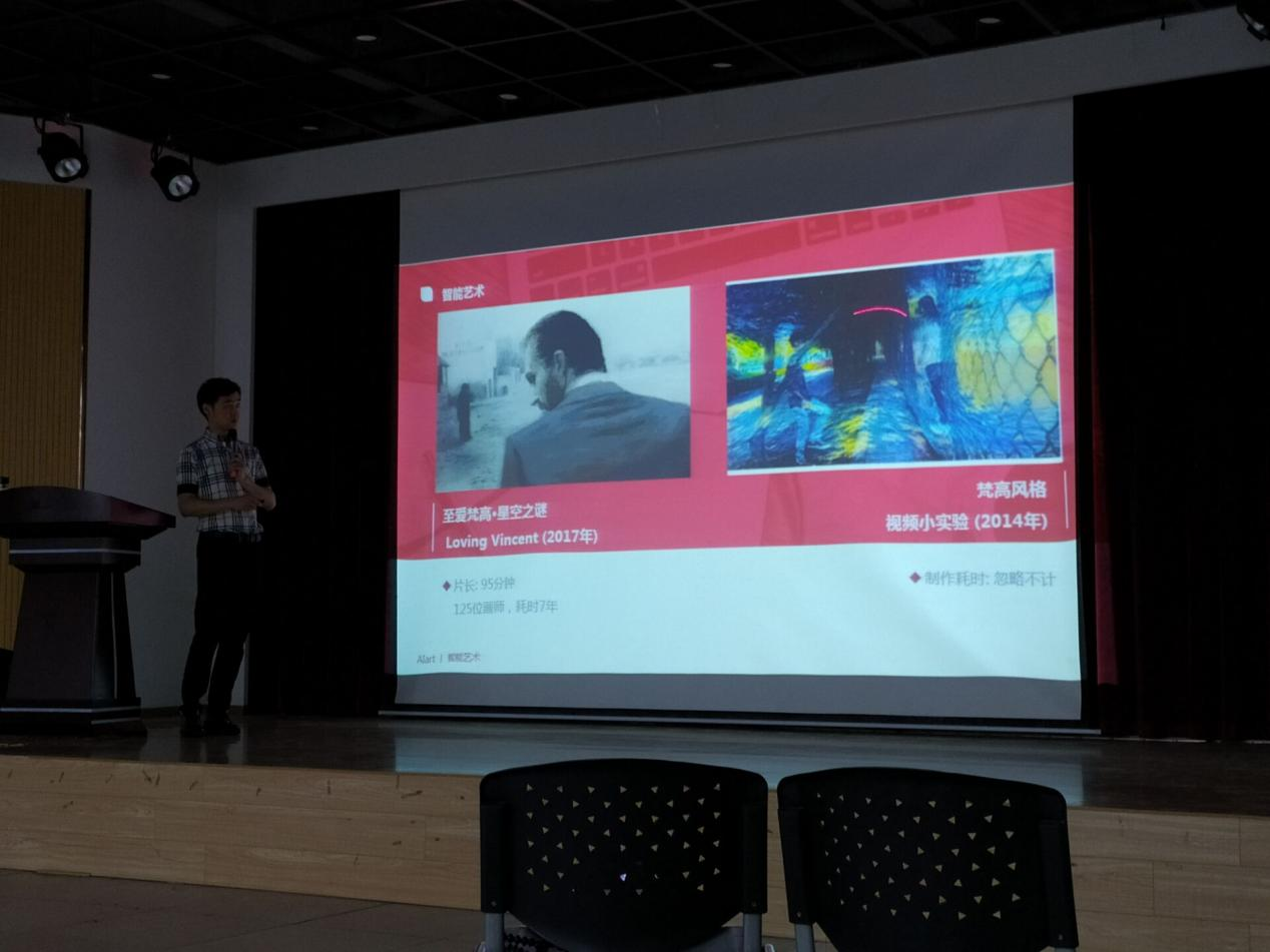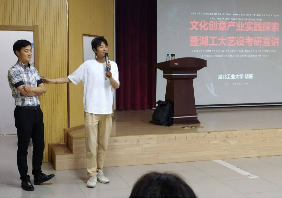 随后饶院长介绍了自己的研究课题,即人工智能艺术在视觉设计中的运用,全国普通高校学科竞赛重要性,智能艺术的产生对绘画技术的冲击与影响,利用人工智能领域的新型算法影响与改变视觉传达设座中饶院长讲到了,运用电脑等新型技术与传统元素的结合,以及与时下流行比如包包、饰品等元素的综合运用。饶院长还例举了许多真实案例例如打造独特的视觉ip形象对品牌的重要性等。紧接着,介绍了湖北工业大学历年来的考研以及录取的情况,使学生了解各个学科考试事项及考试科目,并点评了历年考研的高分作品案例,让同学们深受启发