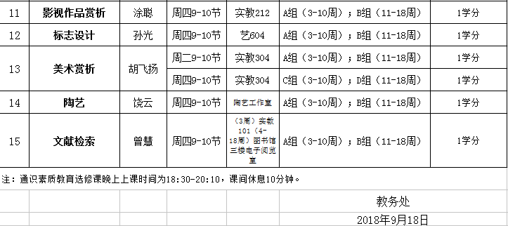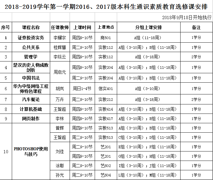 2018-2019学年第一学期2016、2017级本科生通识素质教育选修课安排